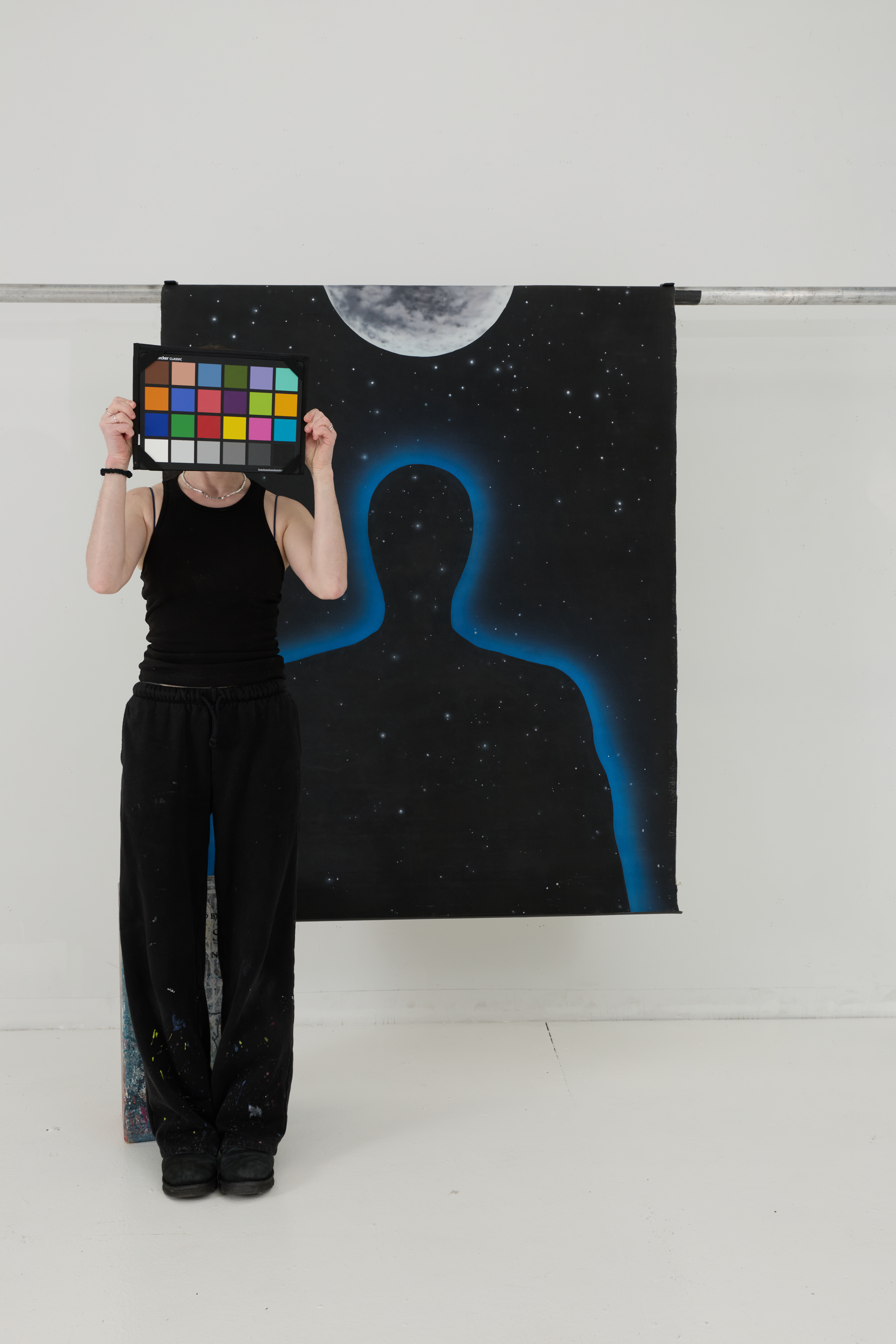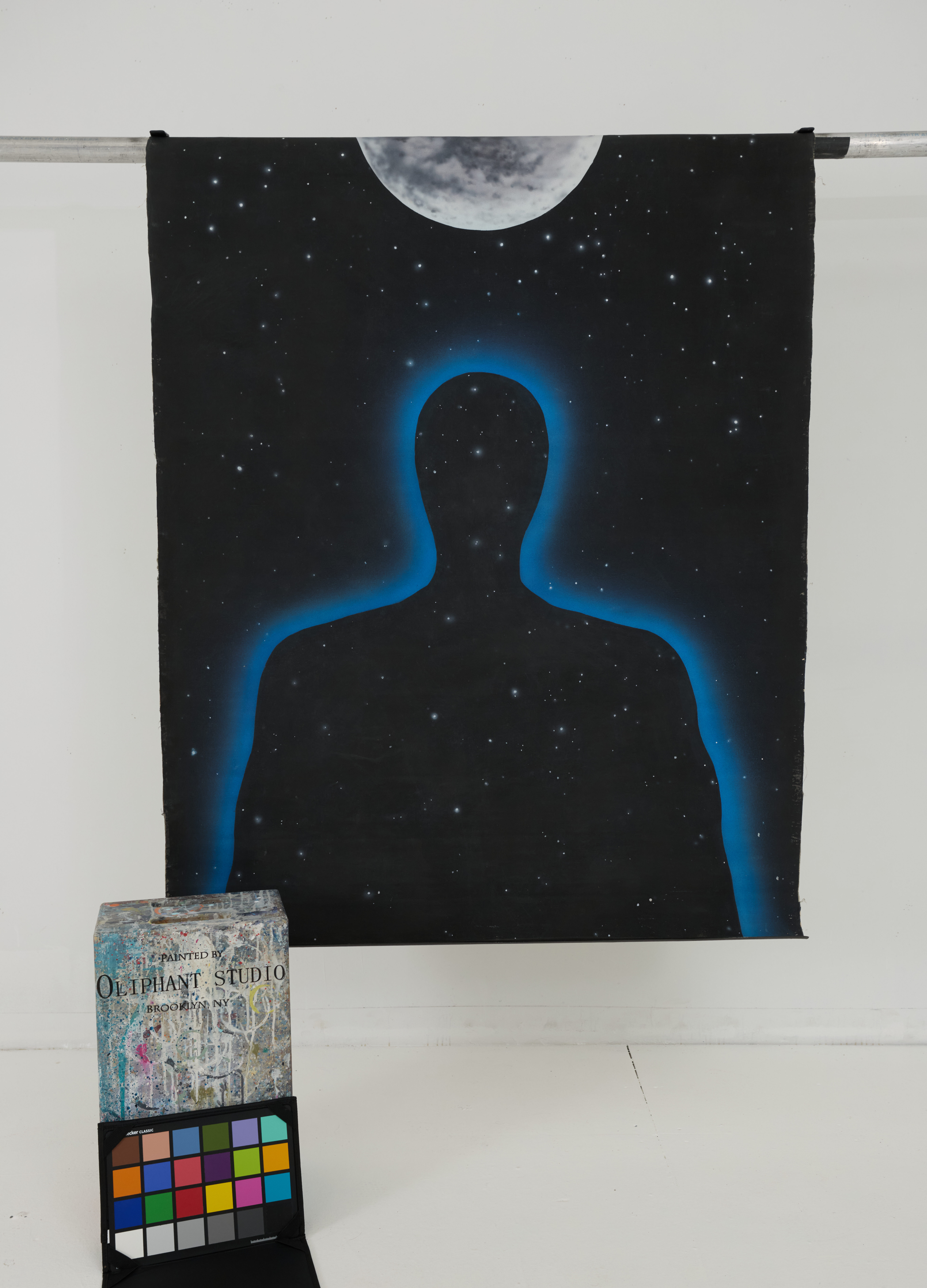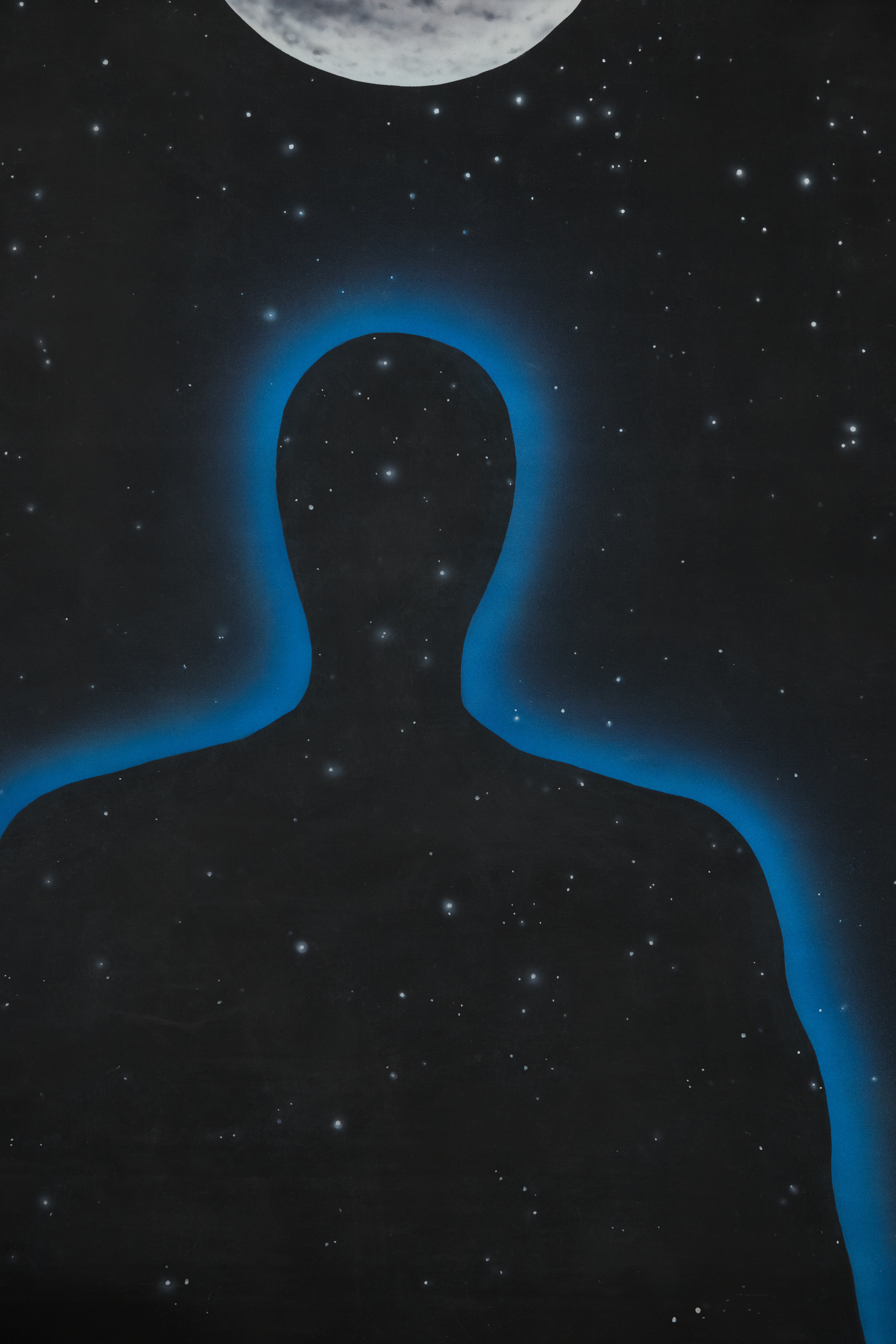 Outer space, moon, stars, silhouette of man with universe background.