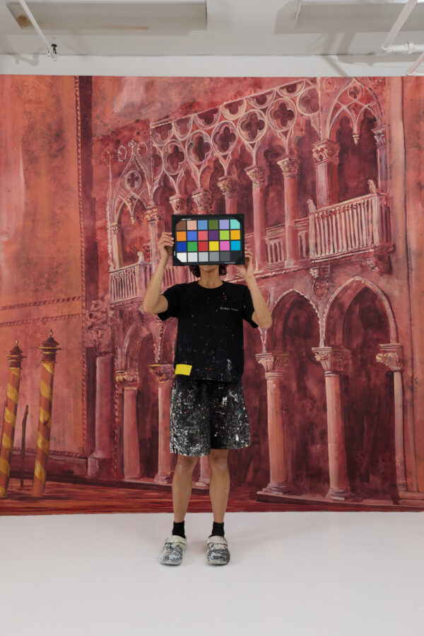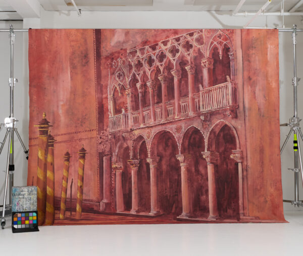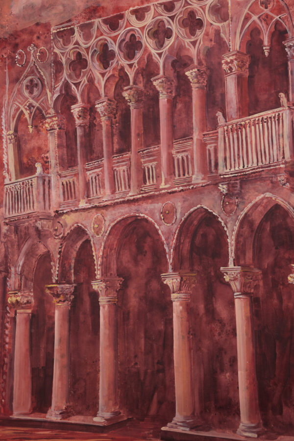 Venetian Gothic architecture with arches, tracery, balcony details, and terracotta tones. Pillars of Venice, Italy.