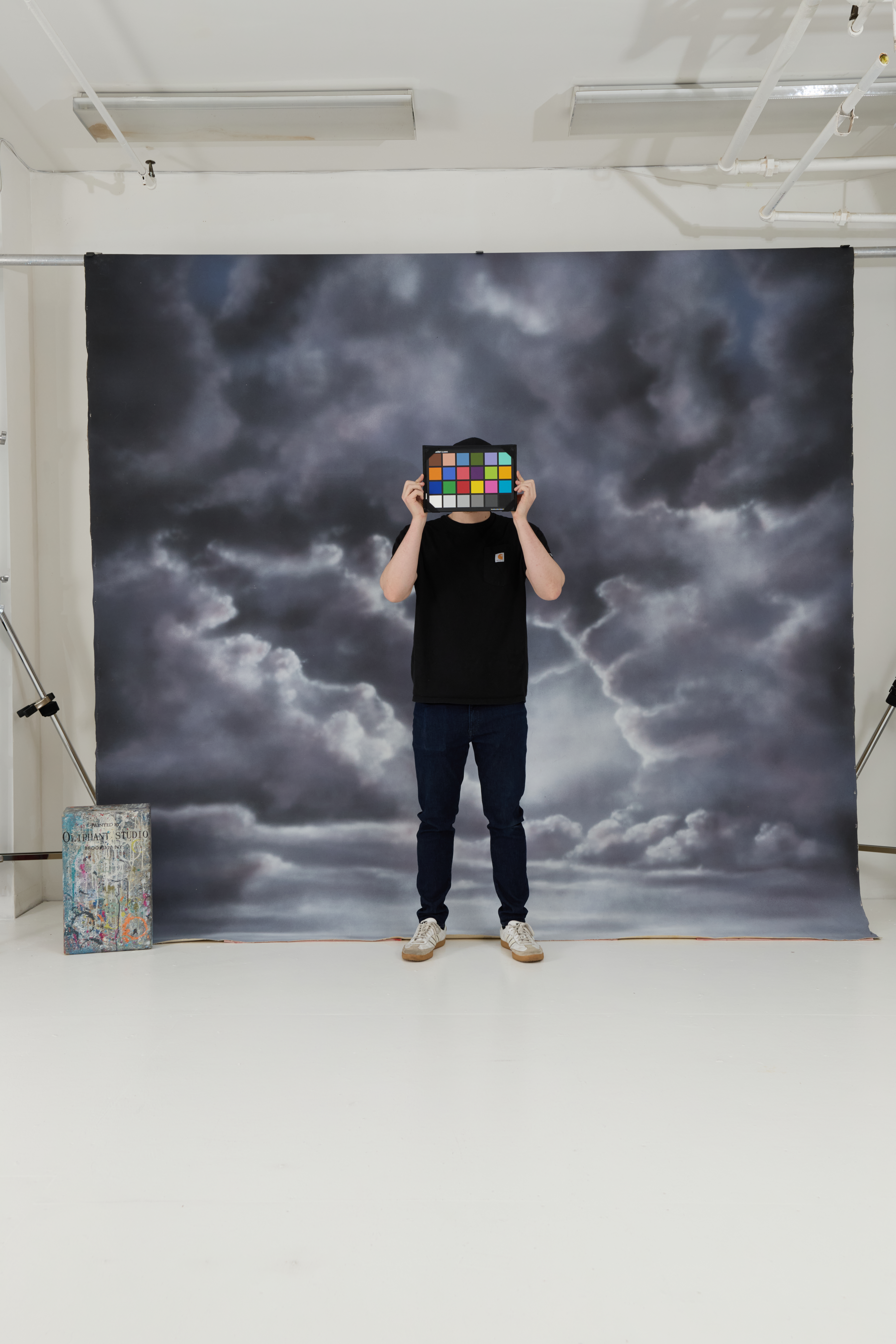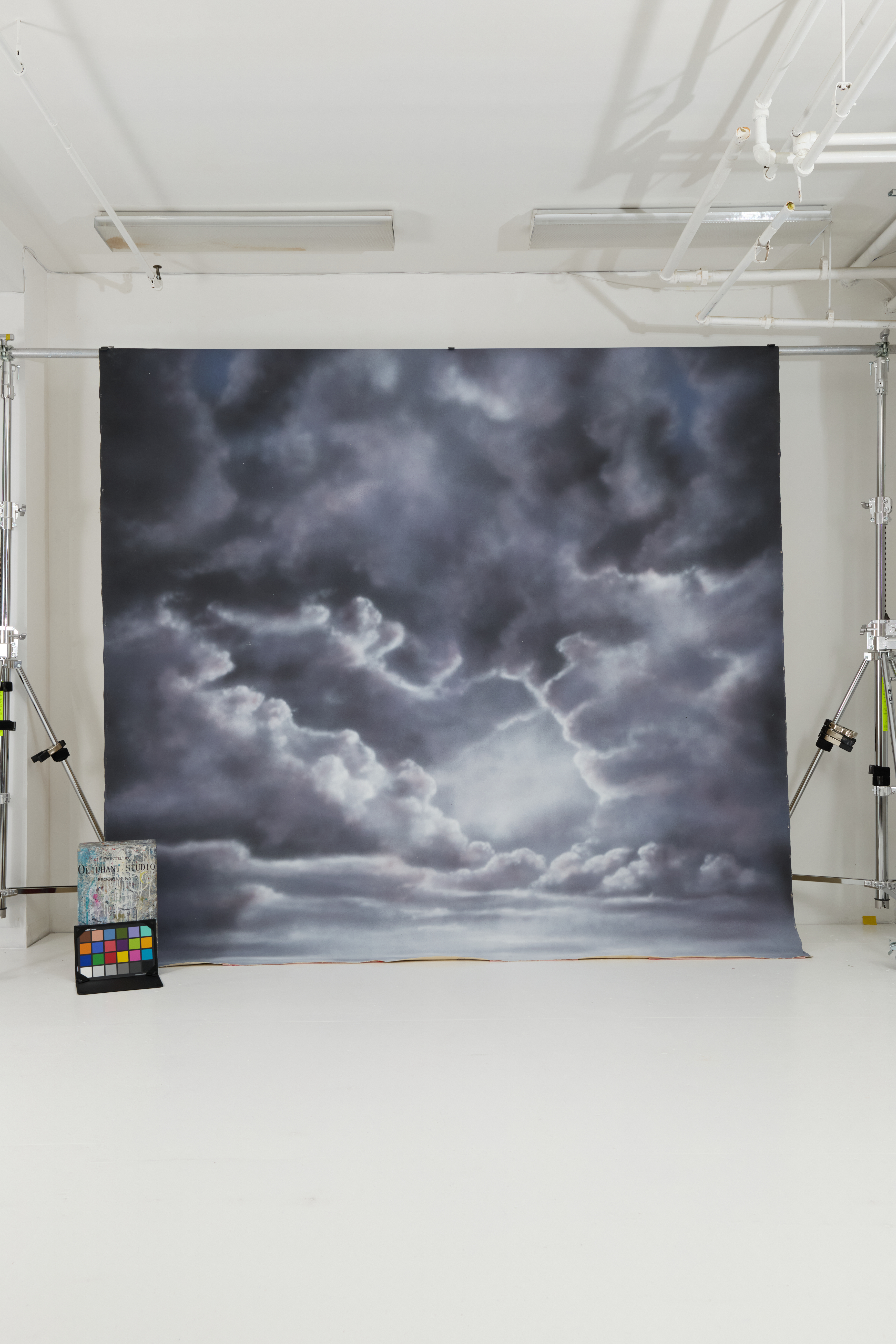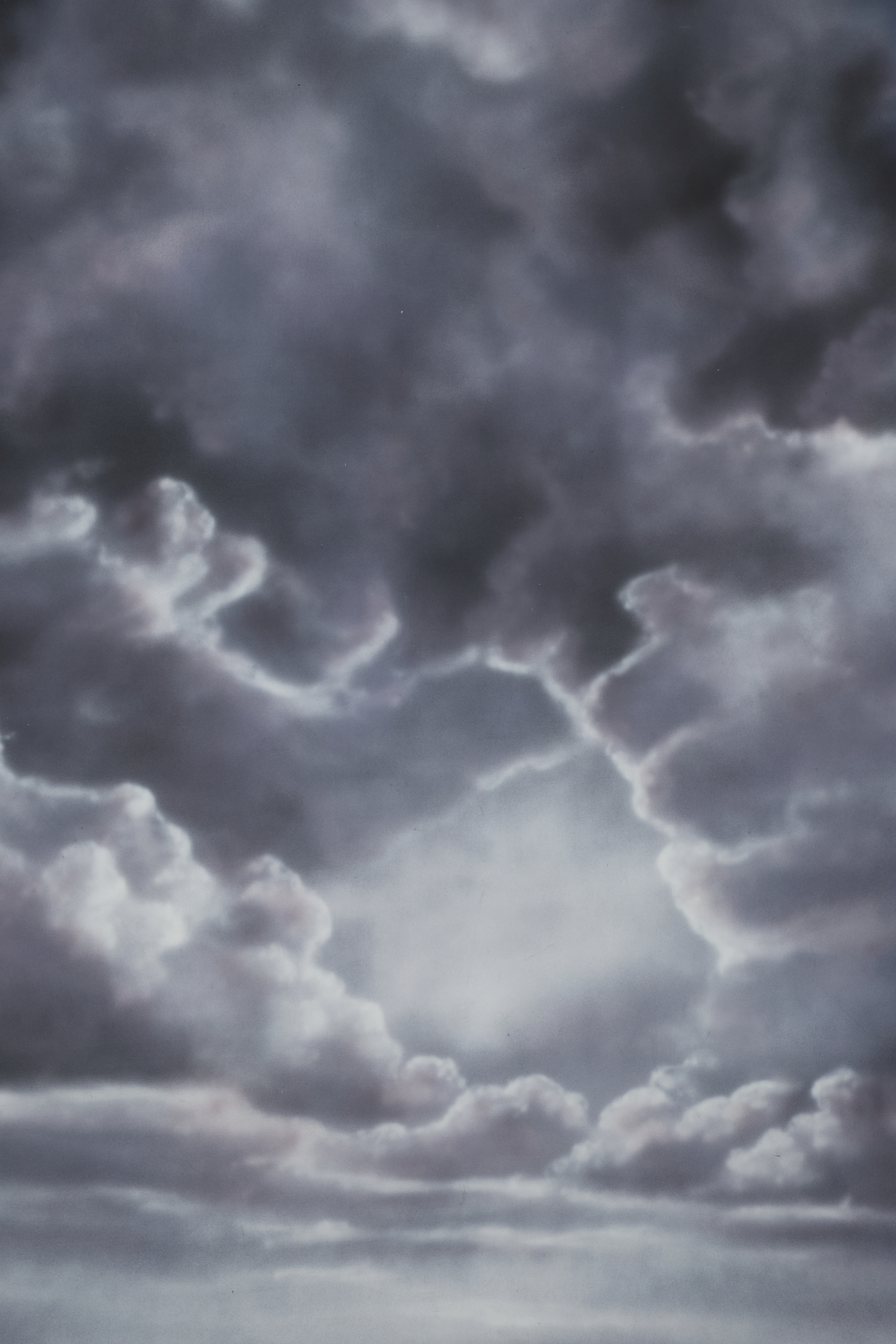 Layered charcoal and slate clouds illuminated by a soft break of light at the horizon