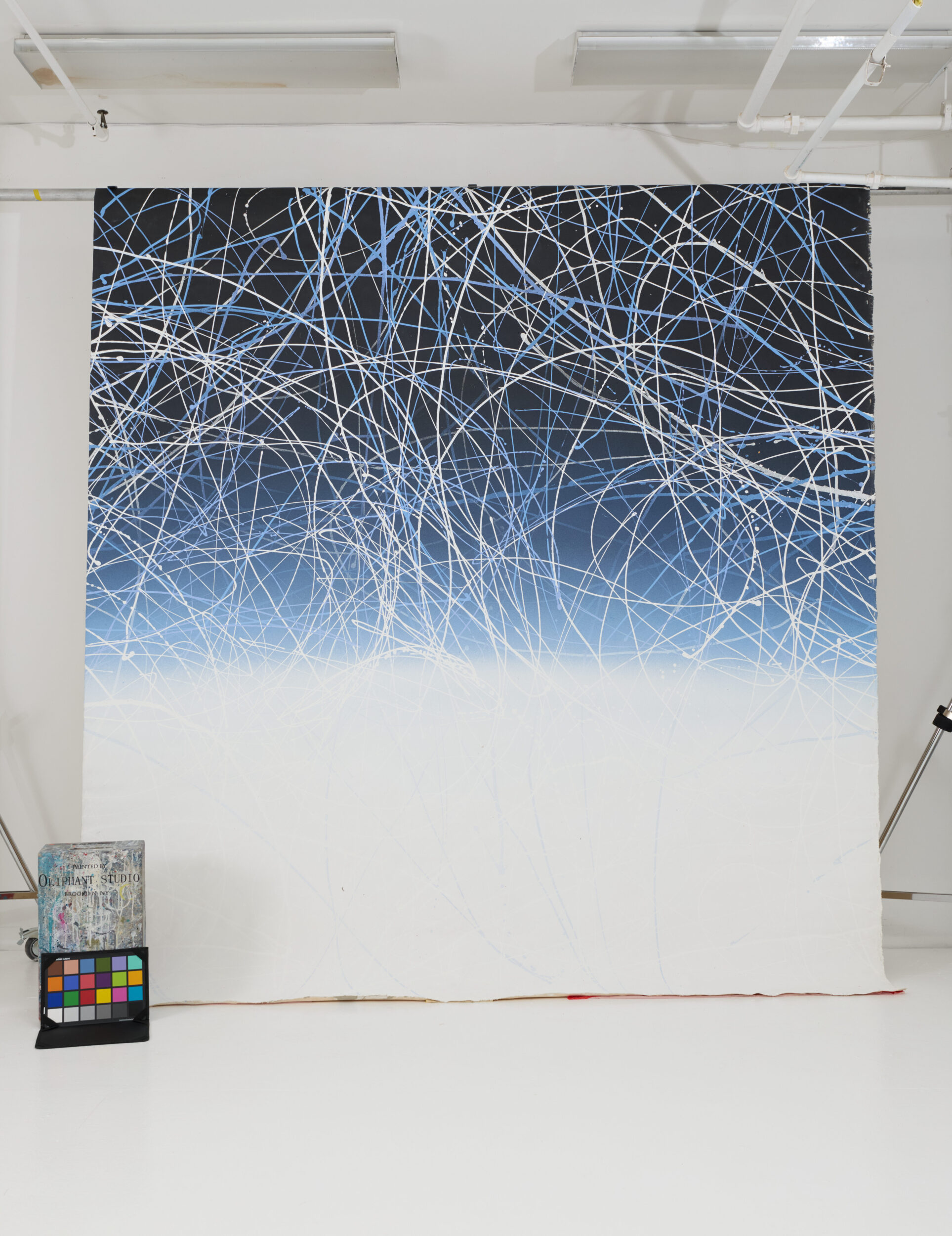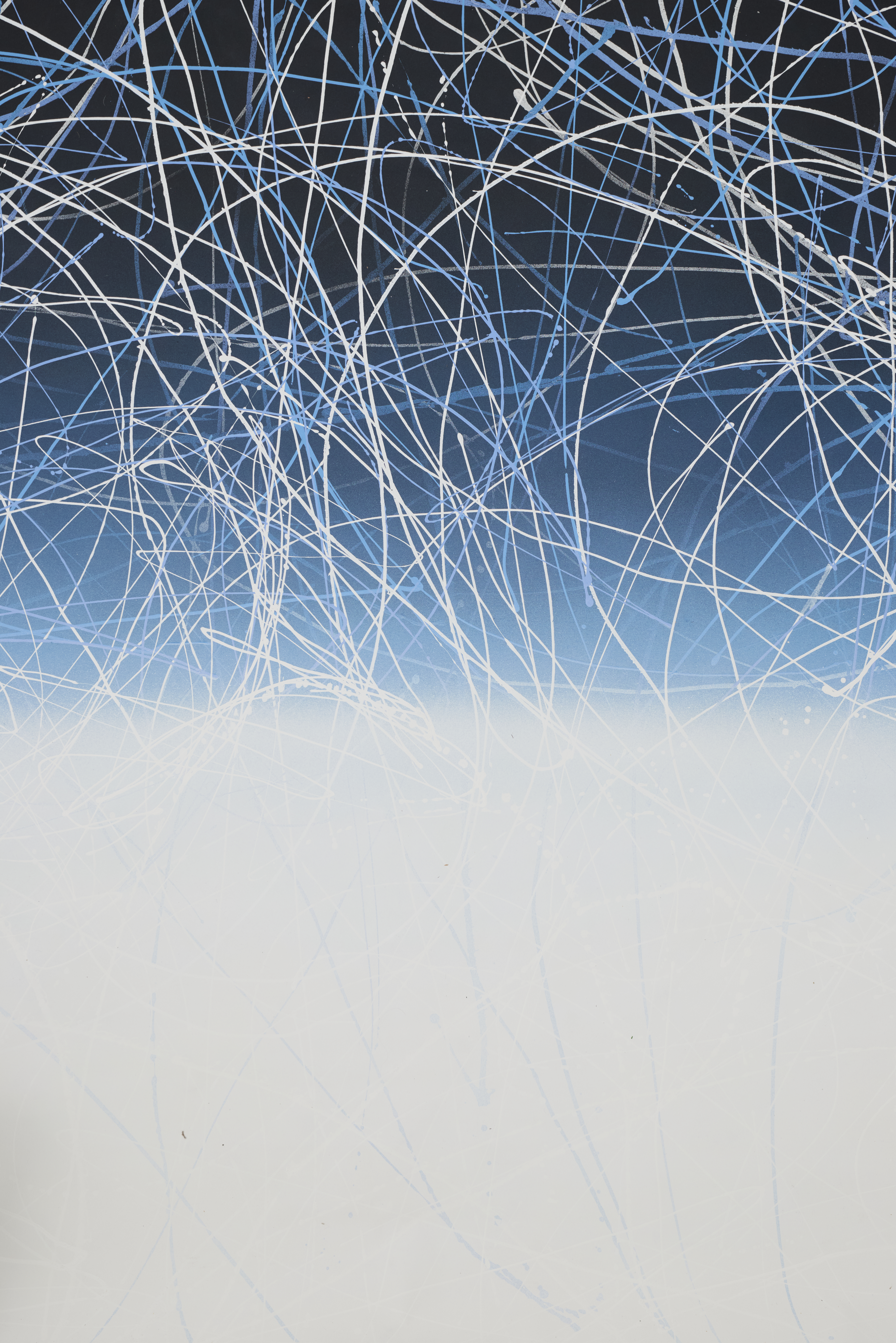 Scribbles, splatter, gradation white, blue, and black. Abstract