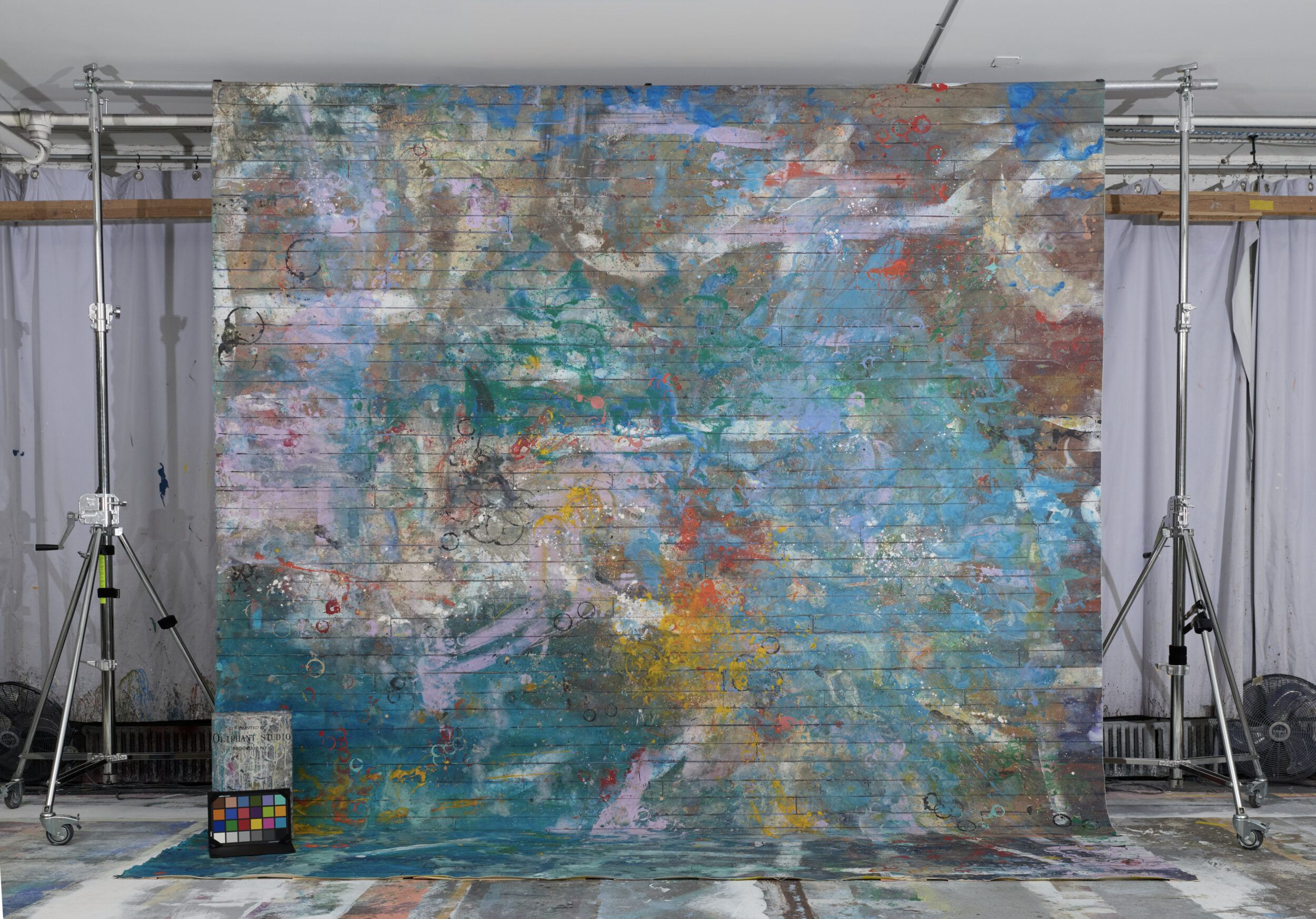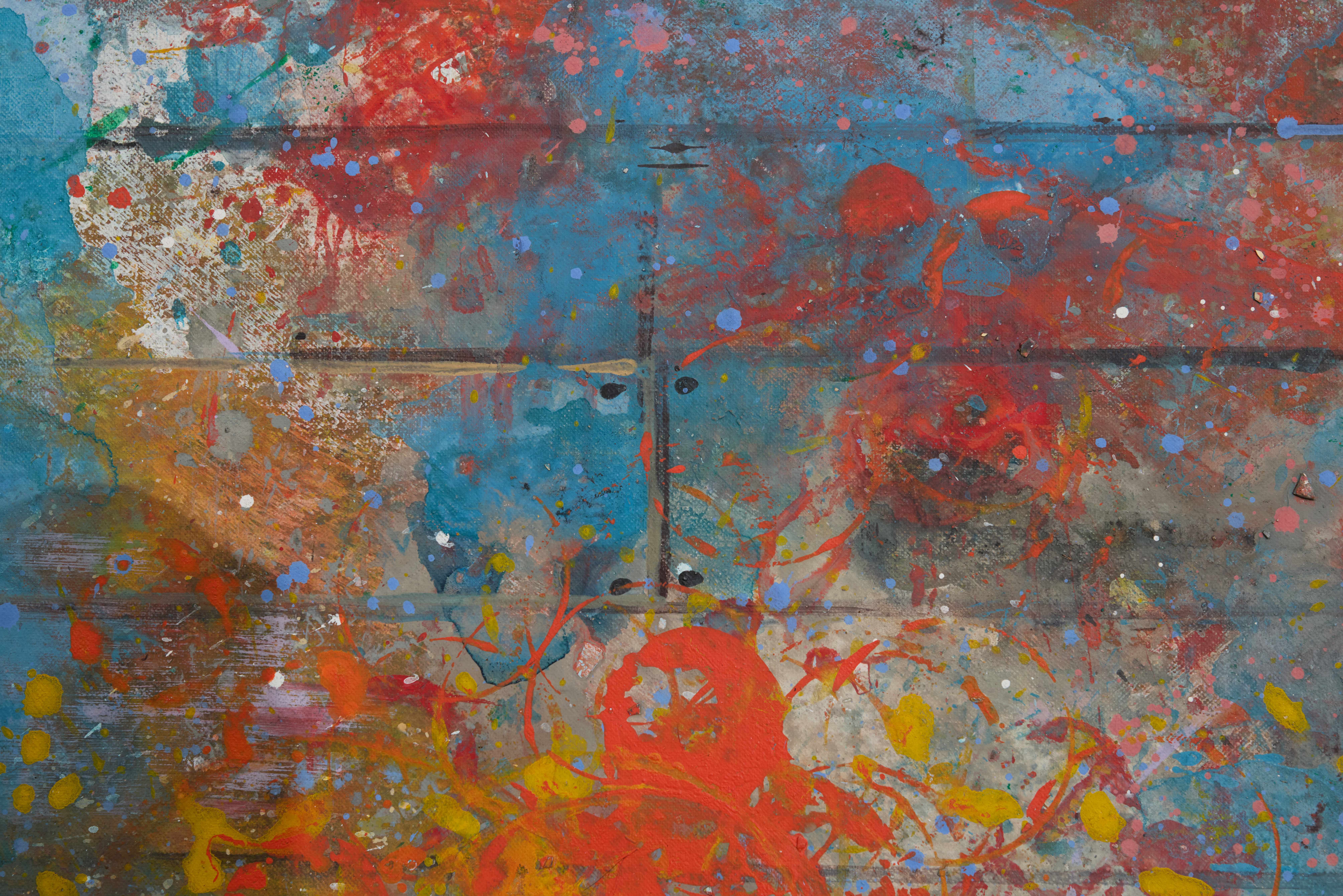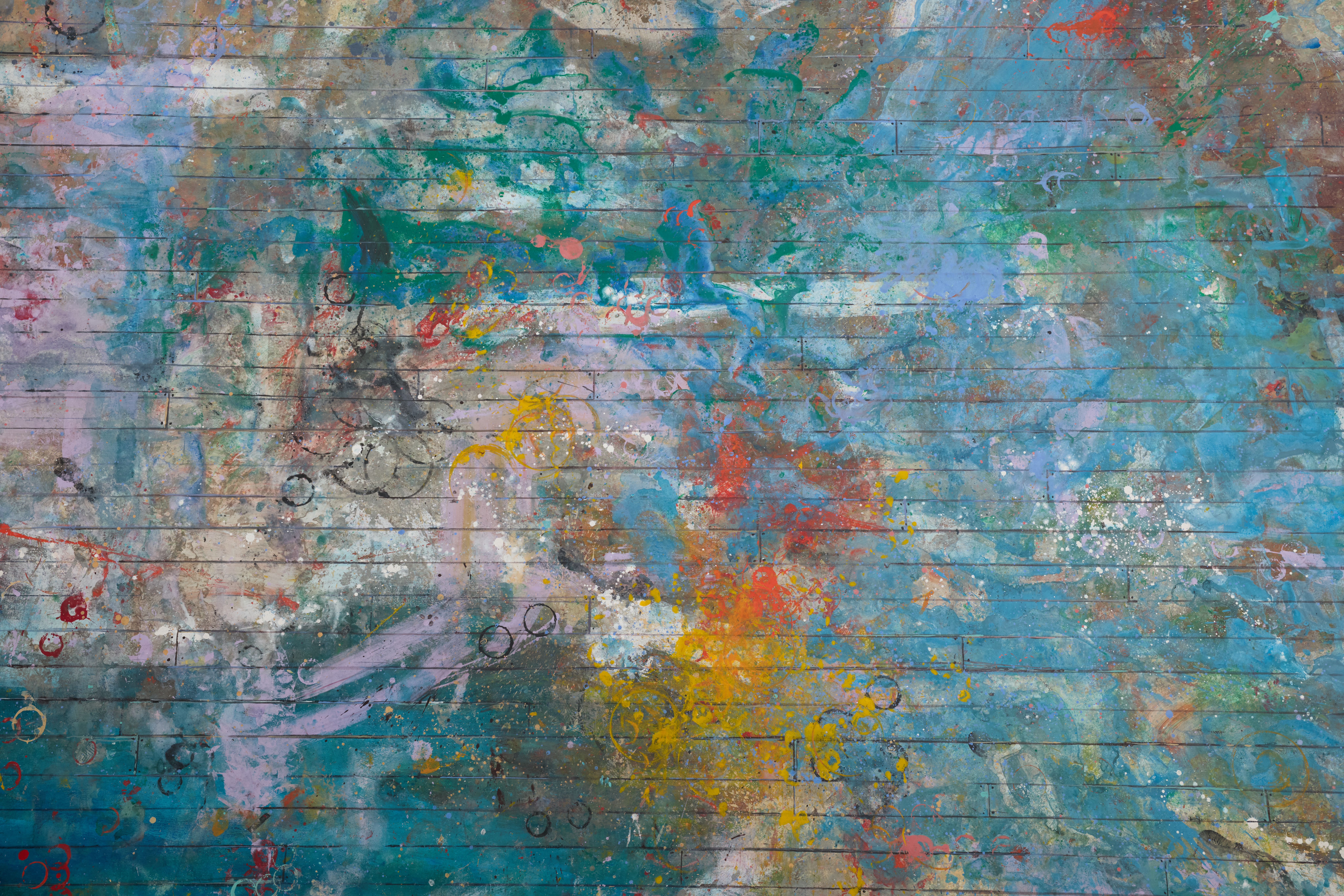 Layered blues and lavenders with playful pops of color. Textured, paint-washed finish reminiscent of an artist’s studio floor or wall.