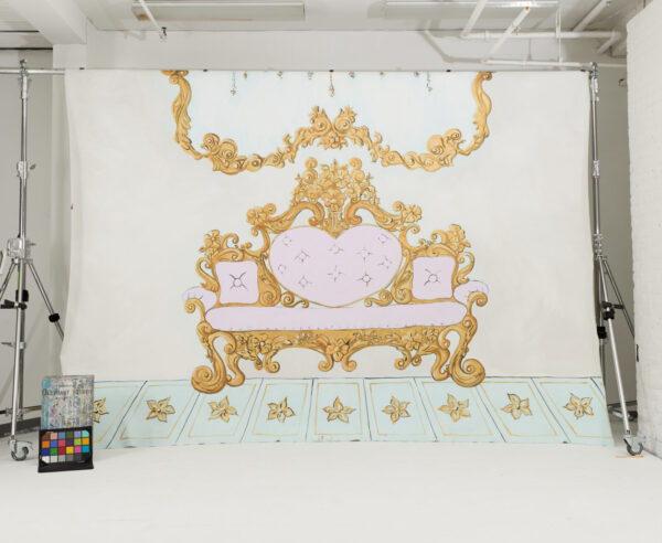 Gold scrollwork loveseat with heart-shaped pink upholstery. Victorian gold mirror. Rococo Revival