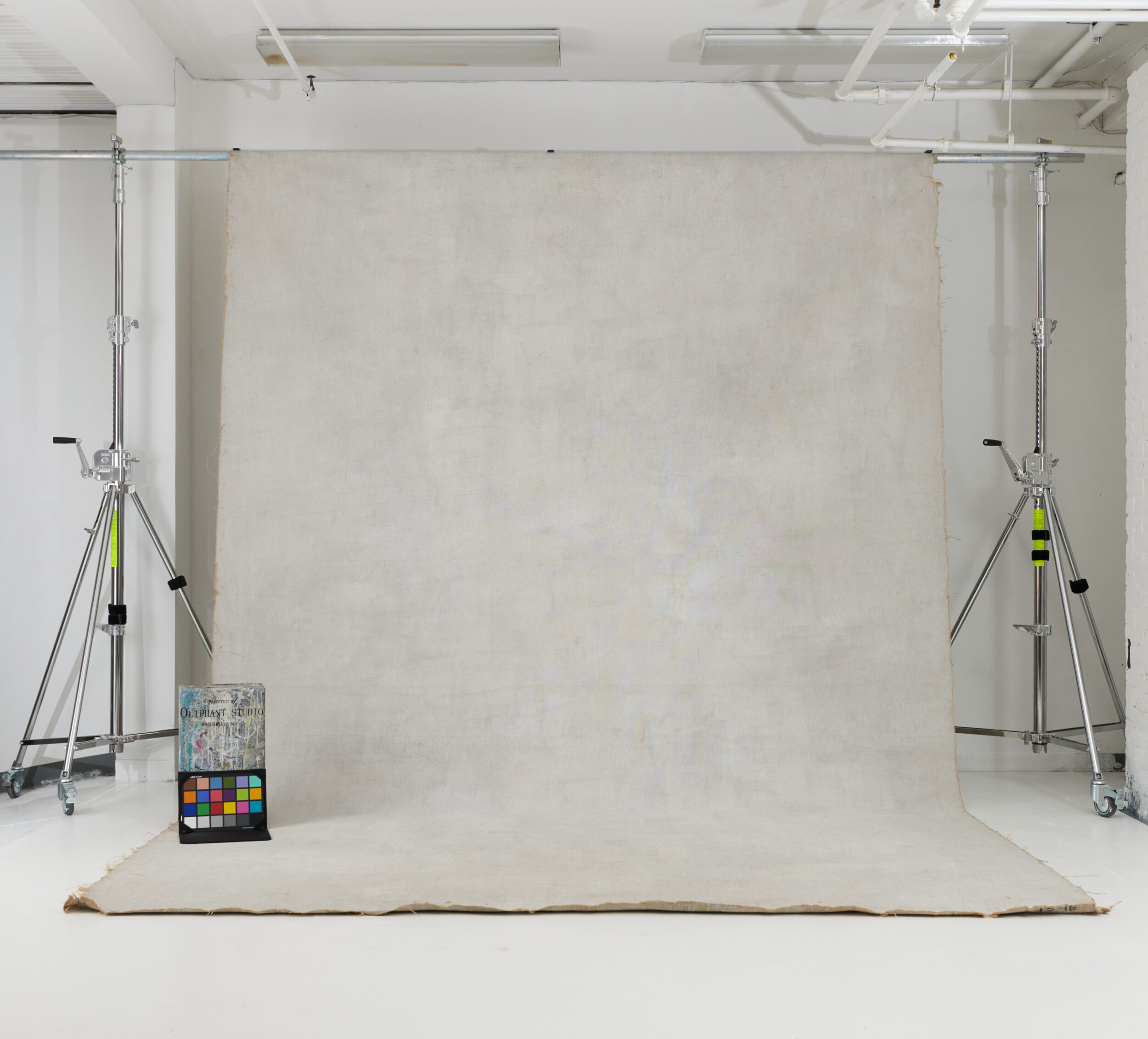 Light grey wash with worn texture. Painted on Burlap. This drop is VINTAGE.