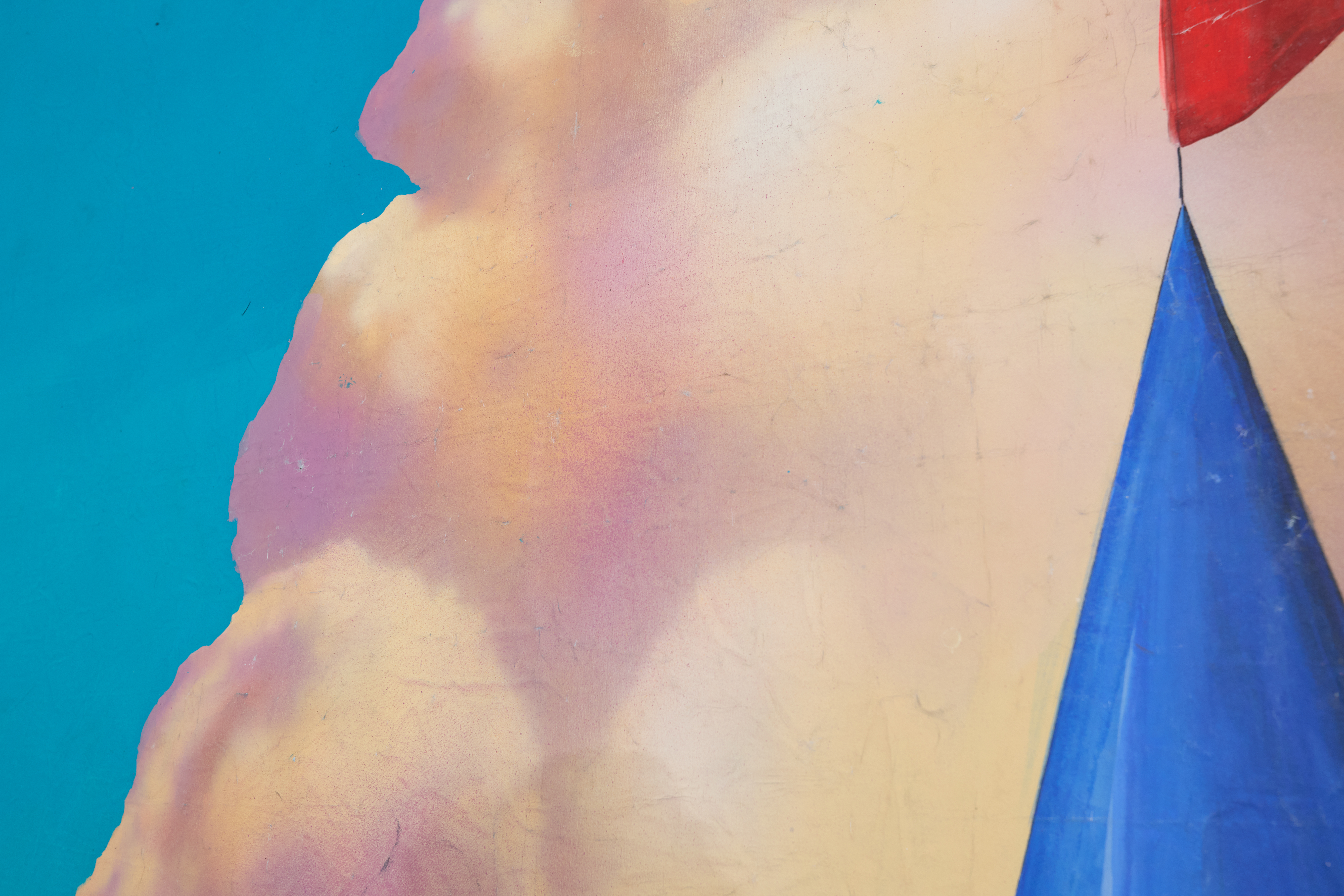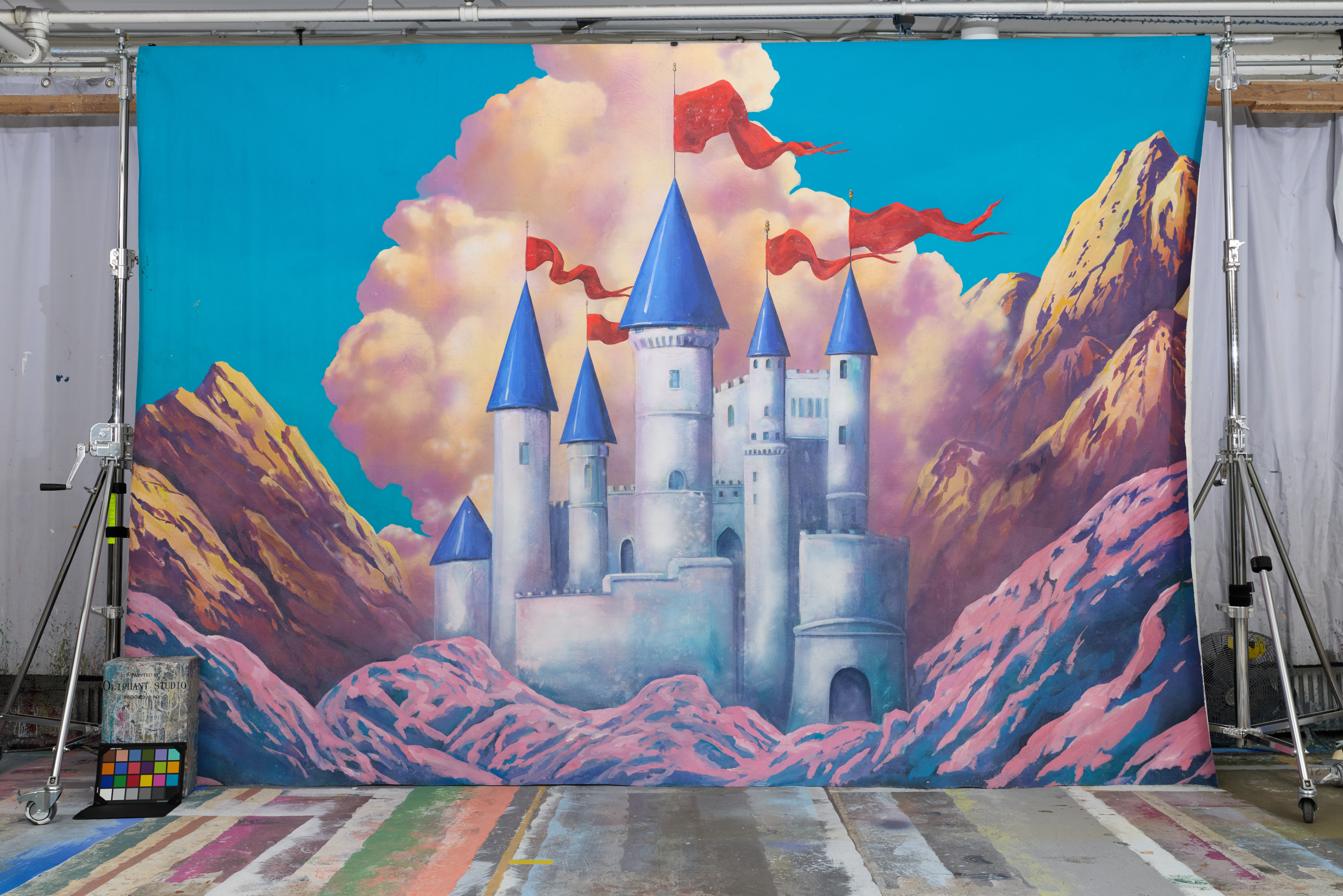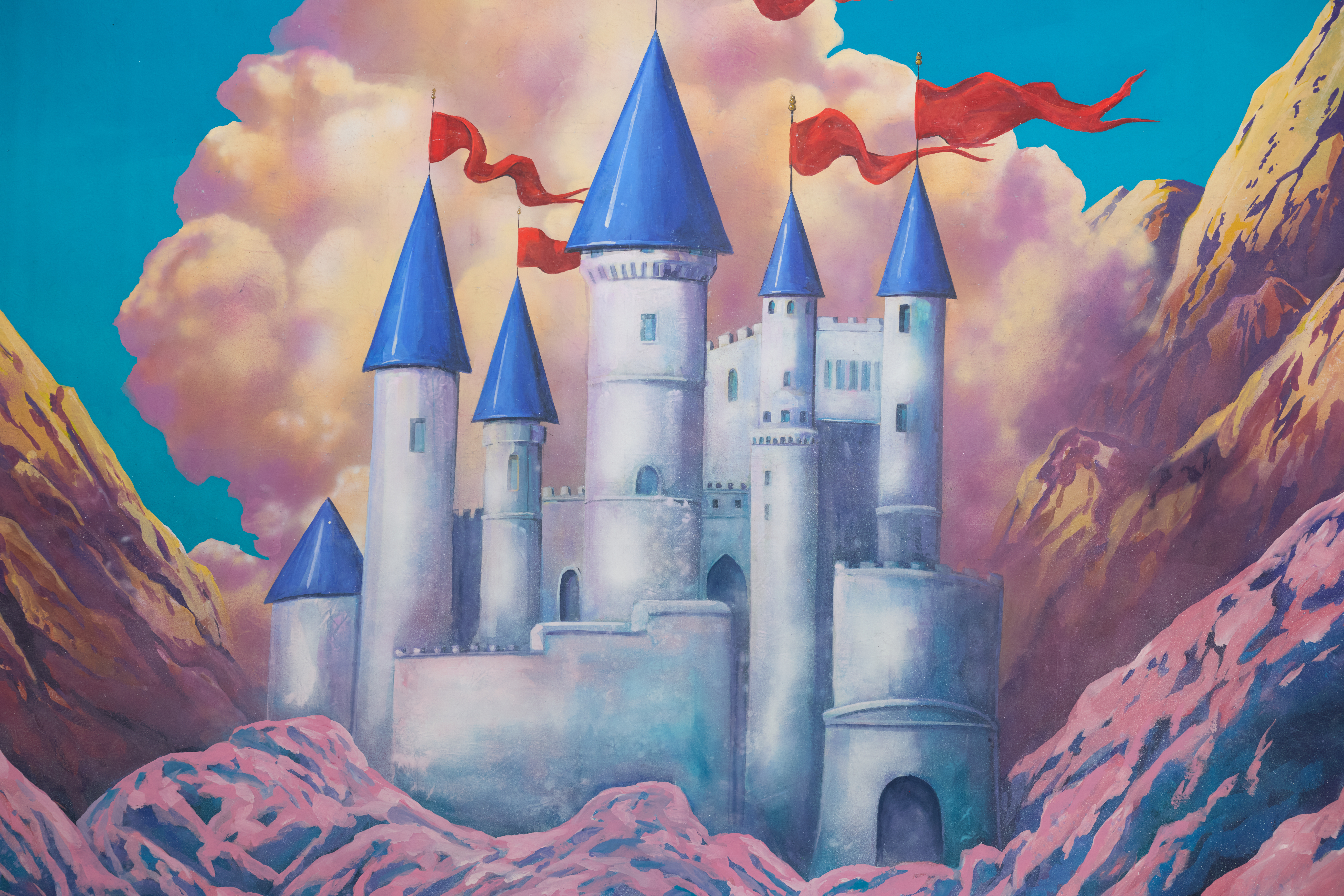 Fairytale castle with stone towers, blue rooftops, red flags, and mountains.Storybook scene. This drop is VINTAGE.