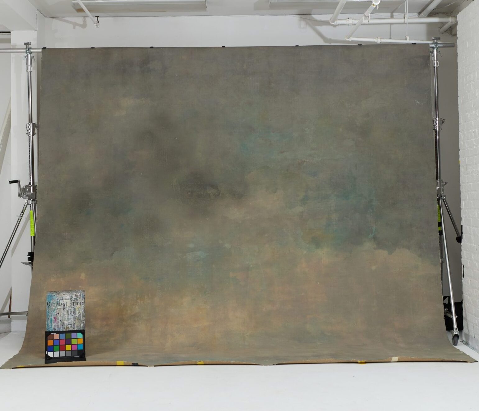 Blend of muted olive green, grey, and brown tones. Subtle hints of teal and golden beige. Organic weathered texture. Wall. Pantone Colors: 4223U 7560U, 2316U, 5493U, 4755U.