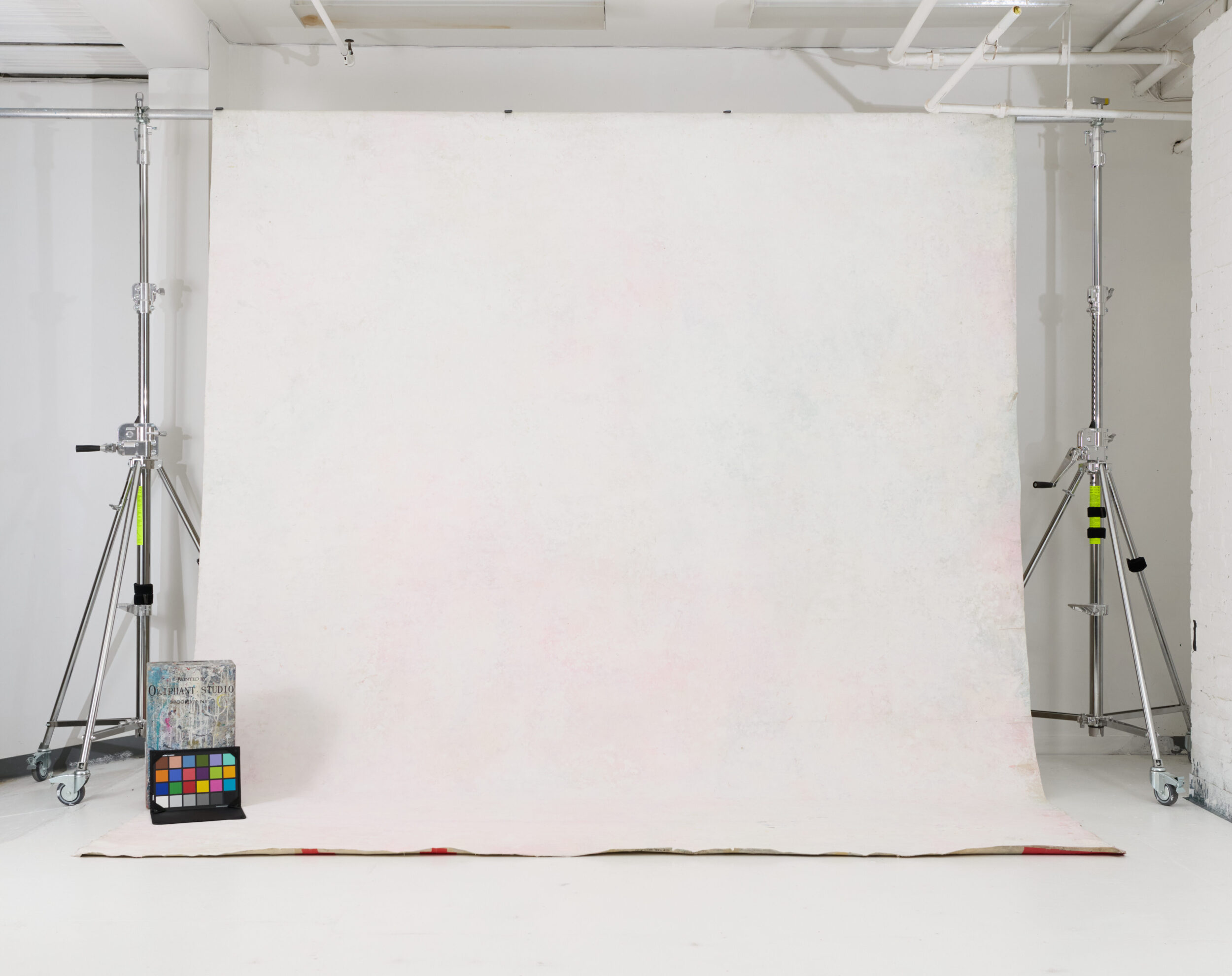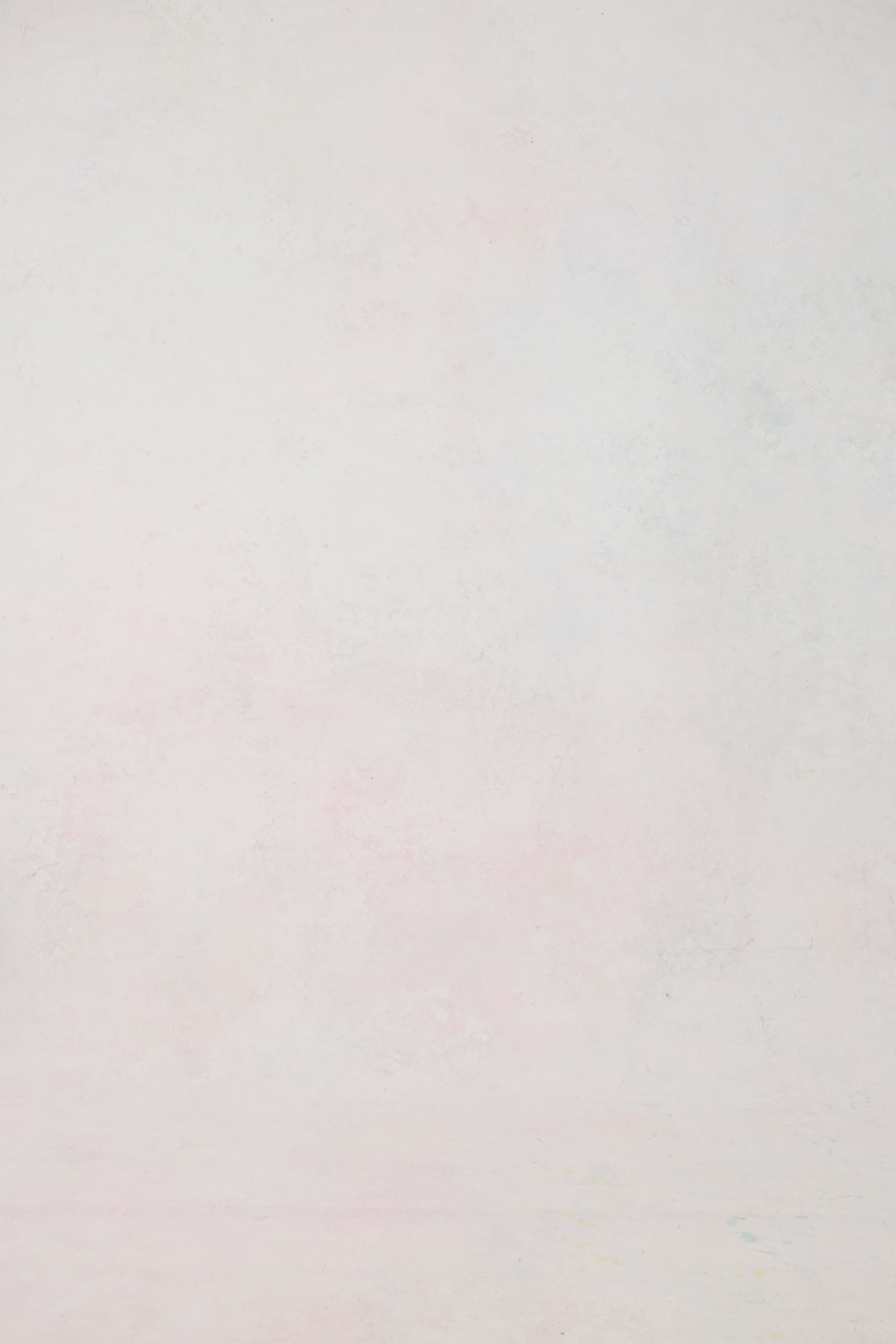 Chalky white tones with pastel-pink accents. Physical texture: Jaxsan. Painted on muslin.