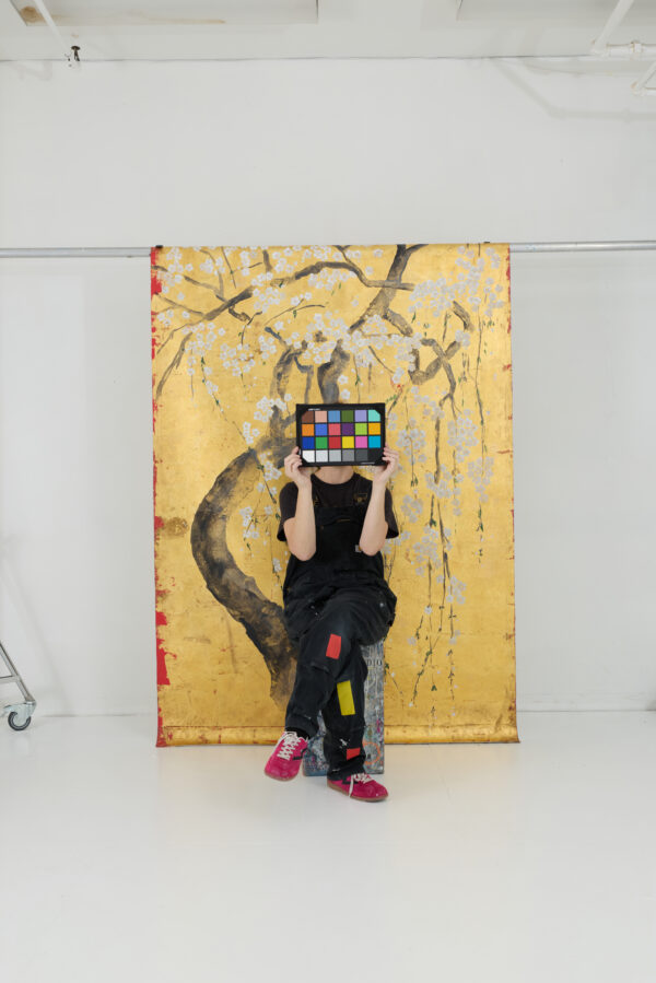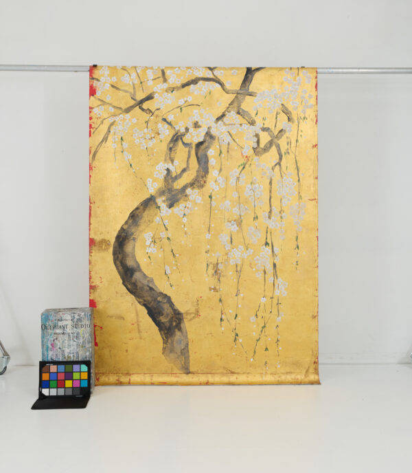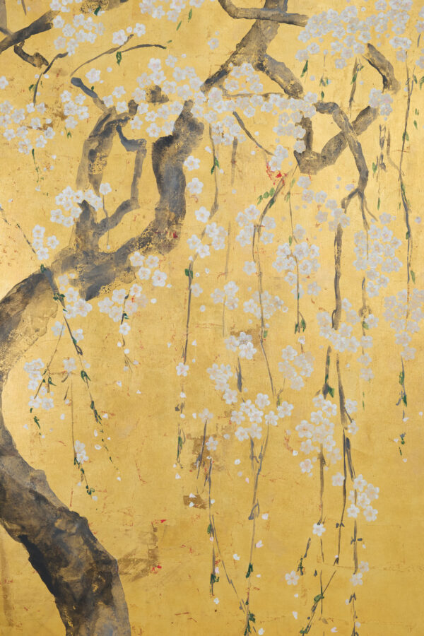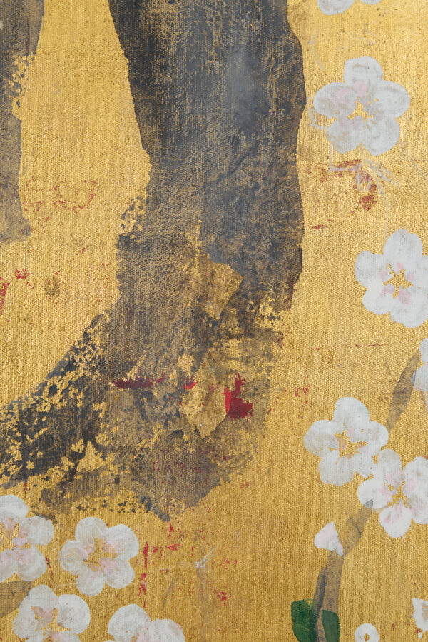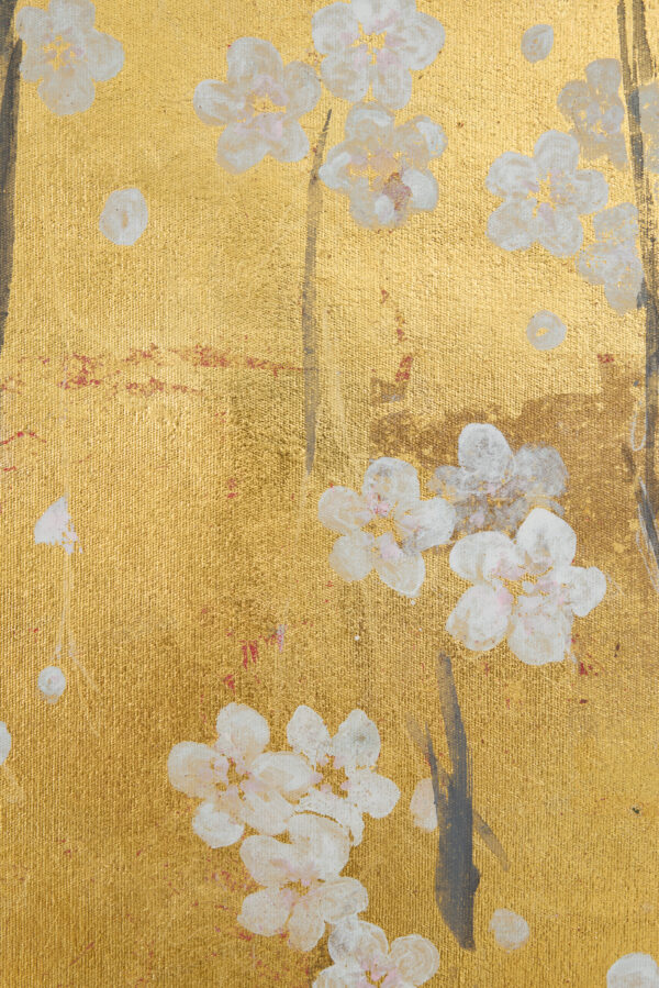 Cherry blossoms with red accents on metallic gold leaf. Inspired by Japanese screen art.