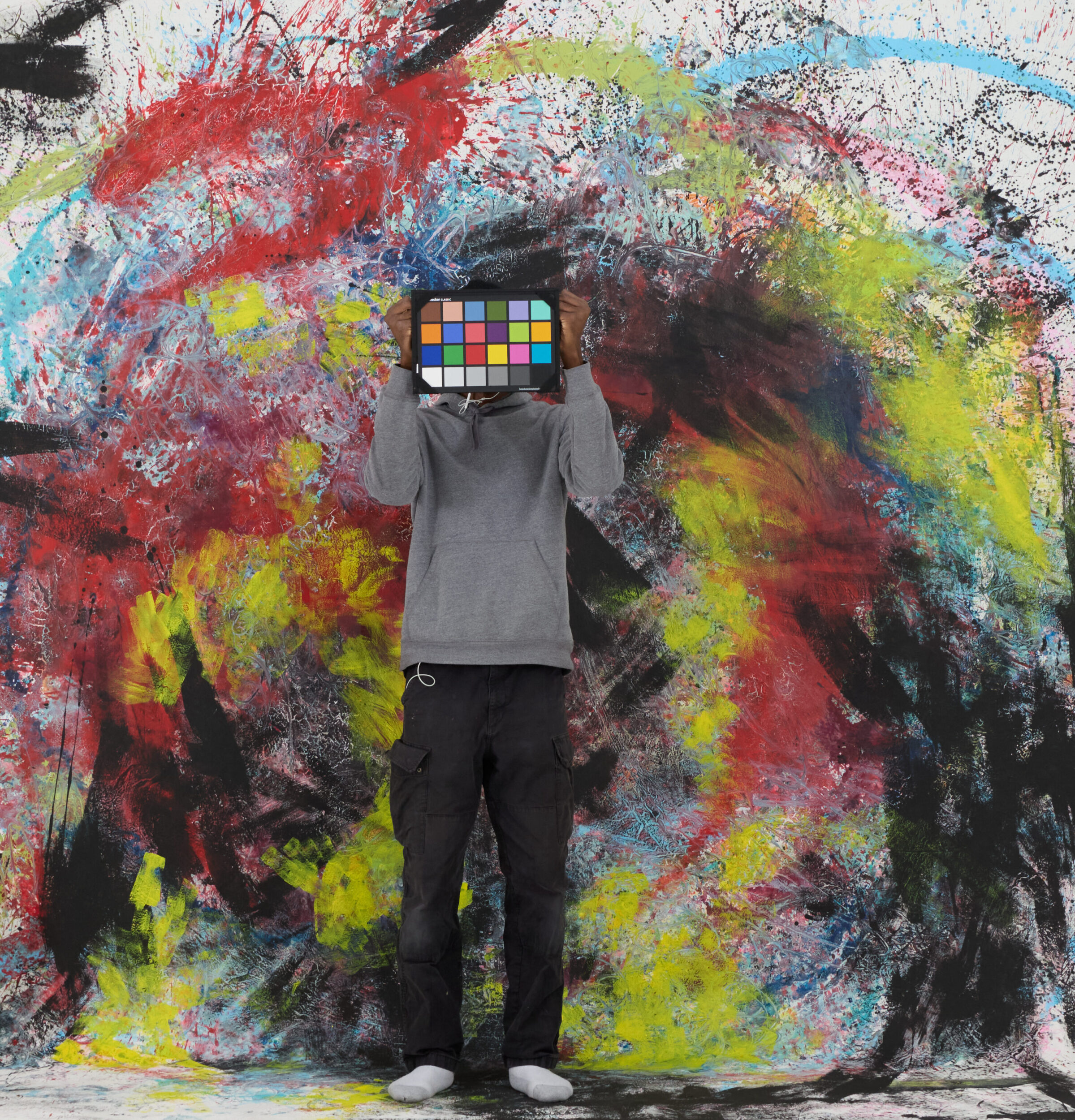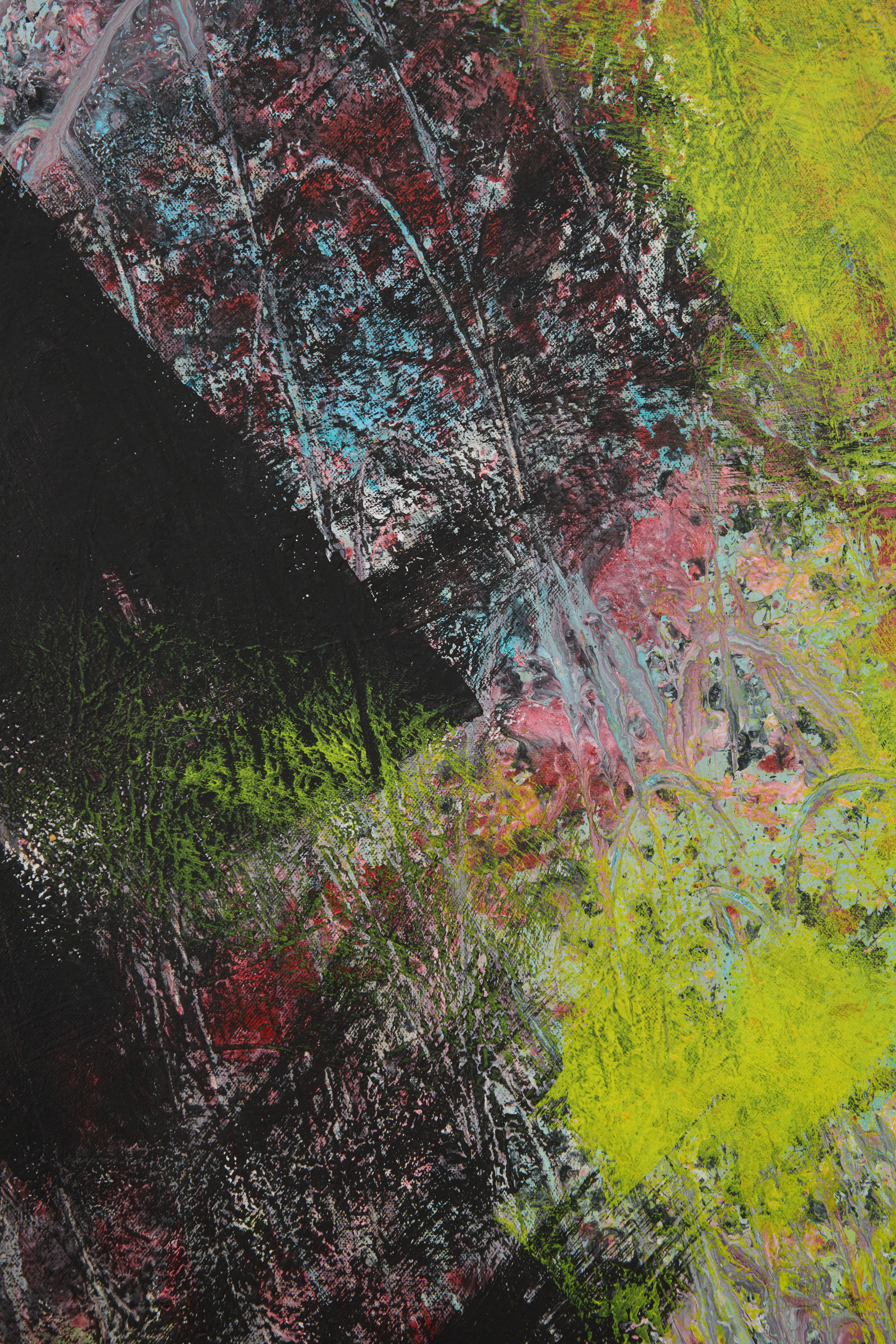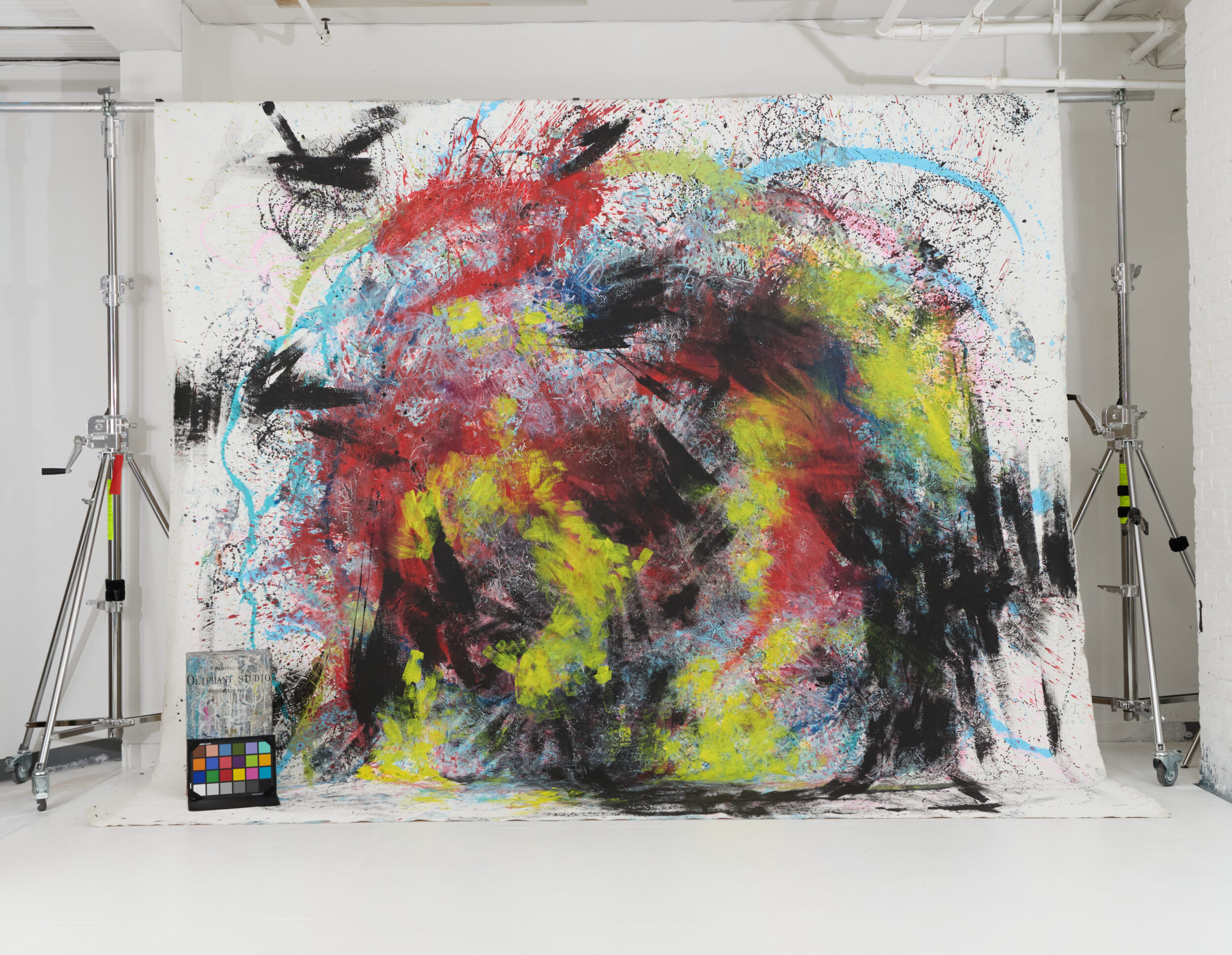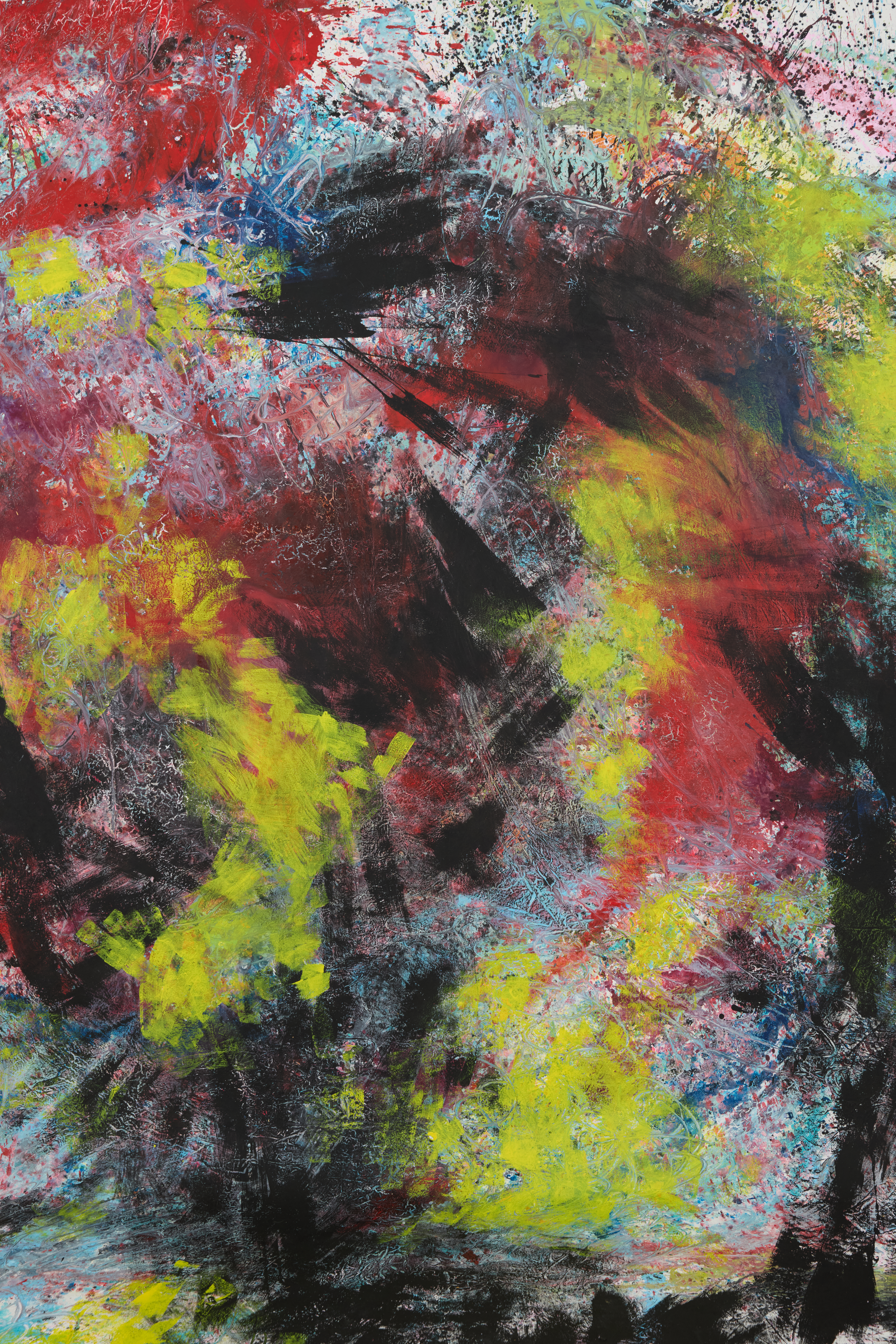 Abstract expressionist. Red, yellow, blue, and black paint splatter layered composition.