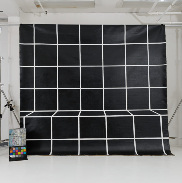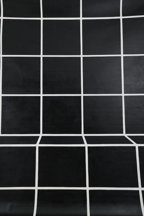 Black and white grid pattern, geometric lines, optical illusion. Trompe-l’oeil cube illusion. This drop has a glass finish.