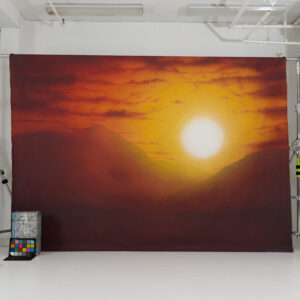 Forest landscape at sunrise or sunset, with silhouetted trees framing a radiant sun.