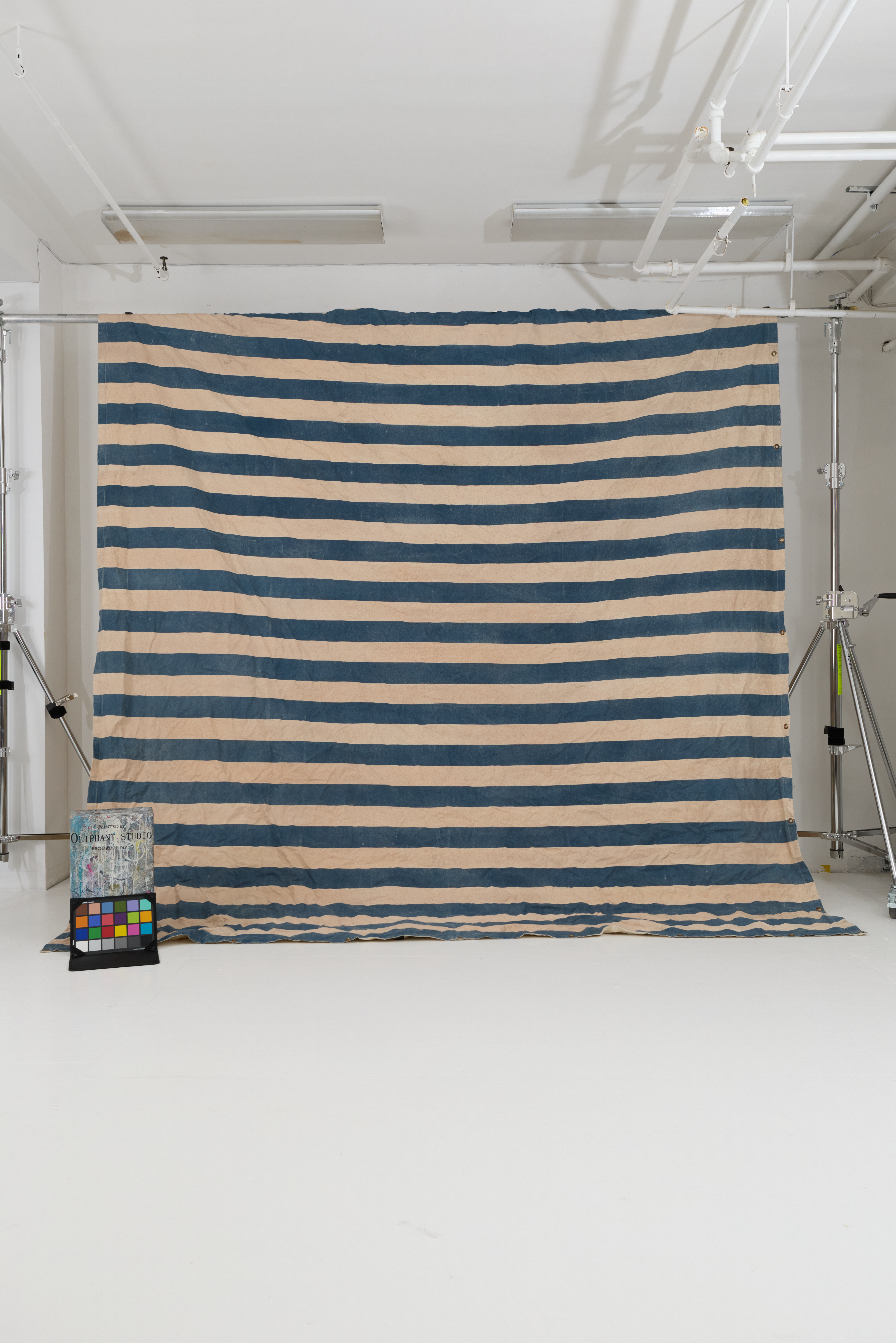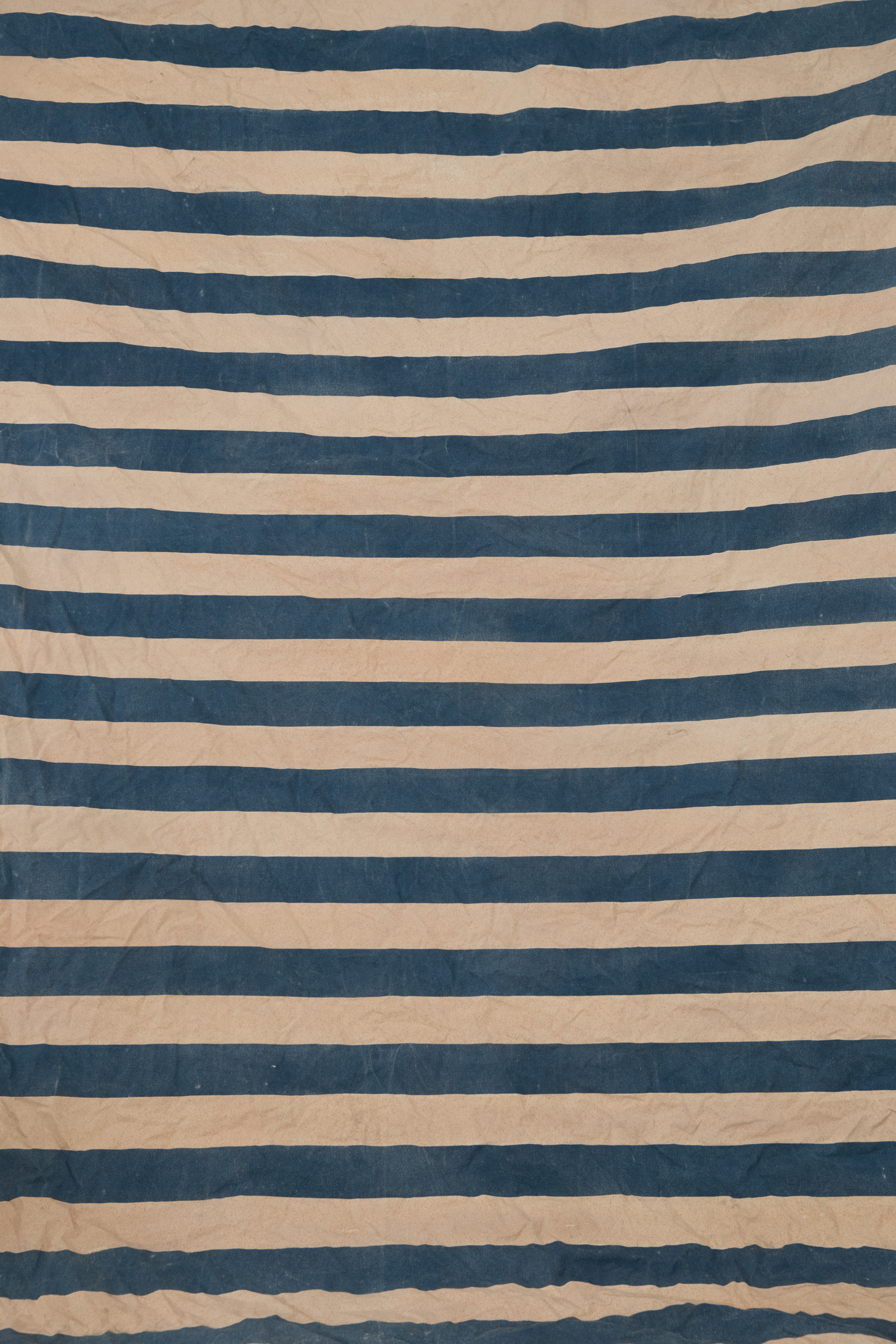 Aged blue and white stripes. Grommeted on all sides. Pantone Color: 7469U, 482U.