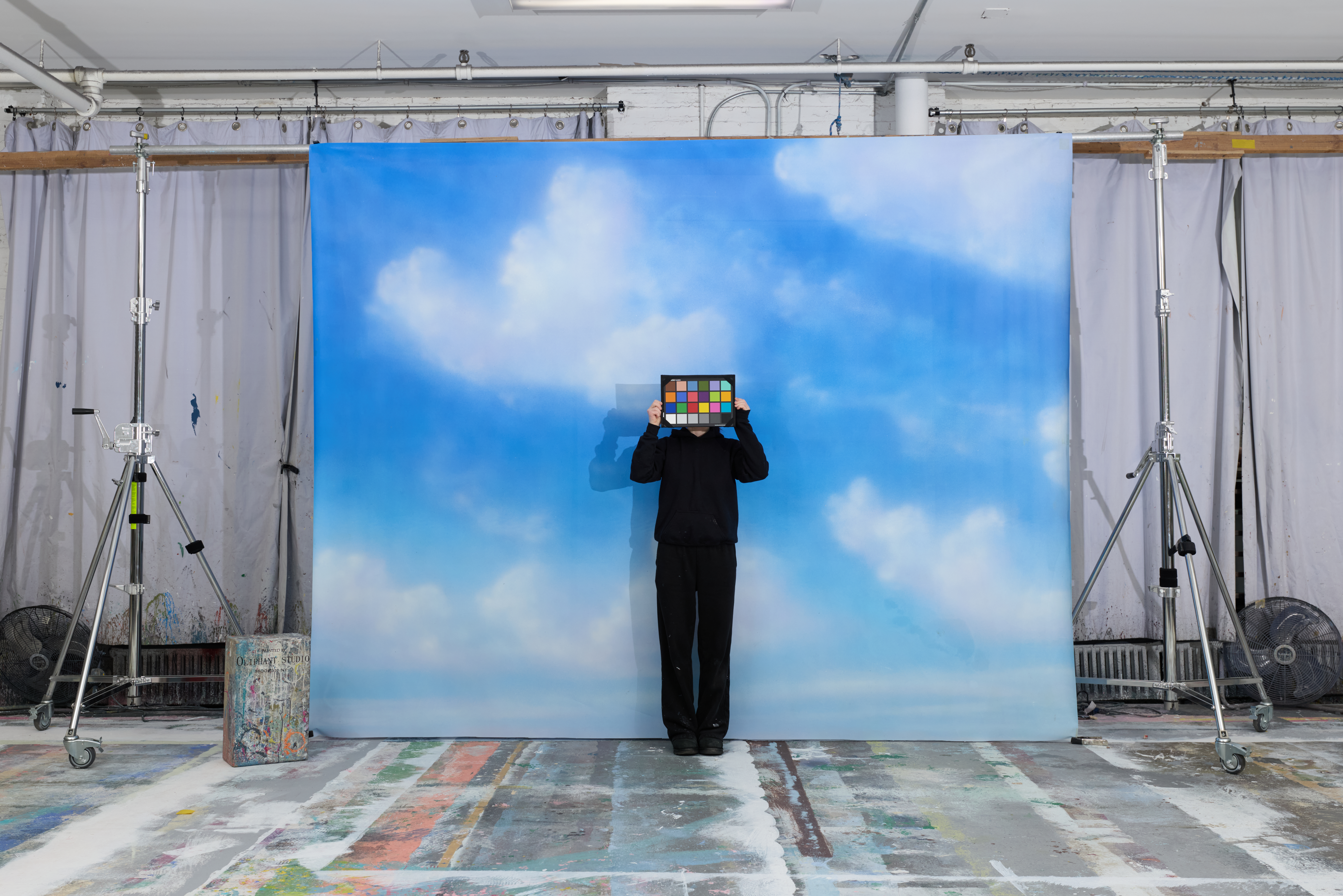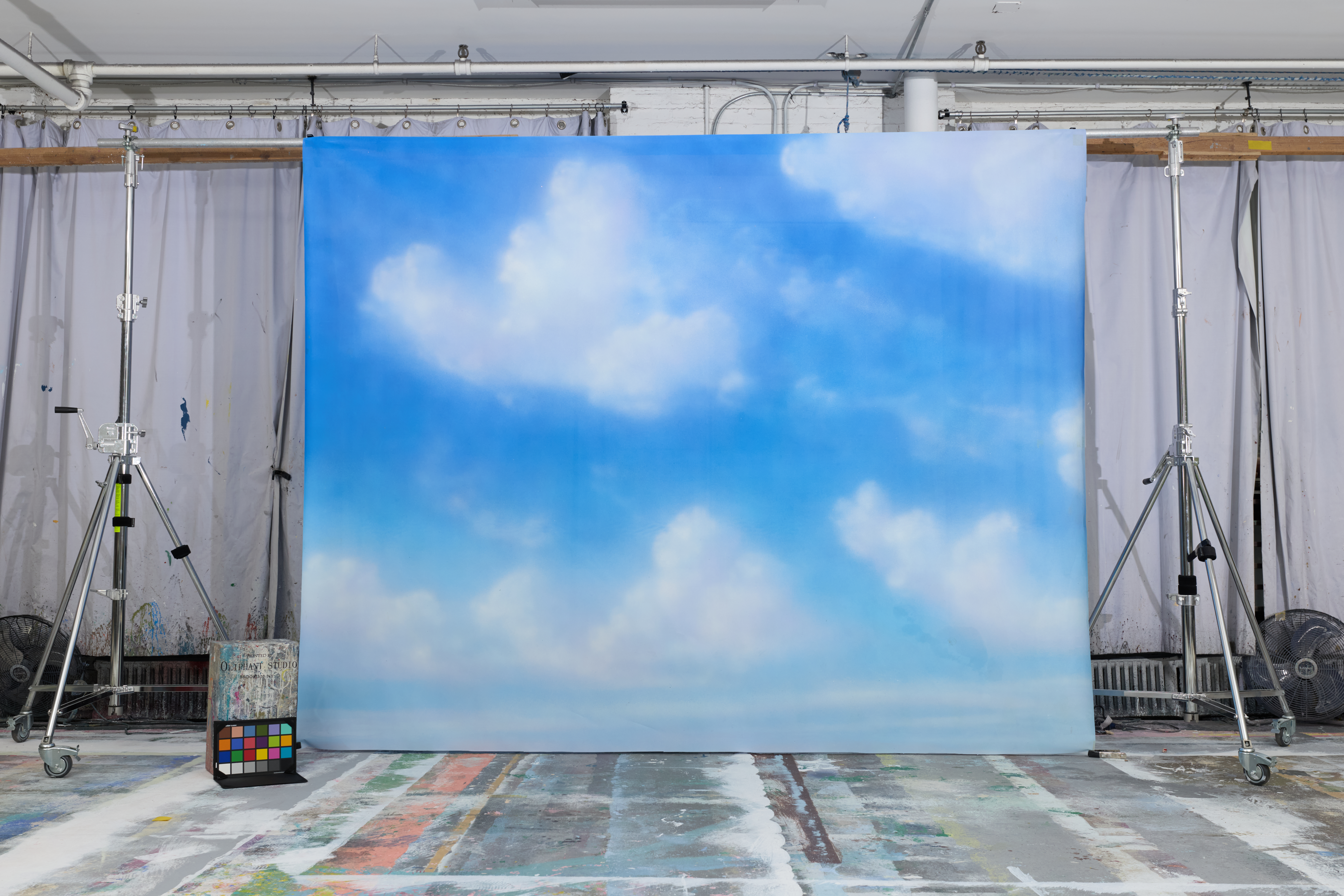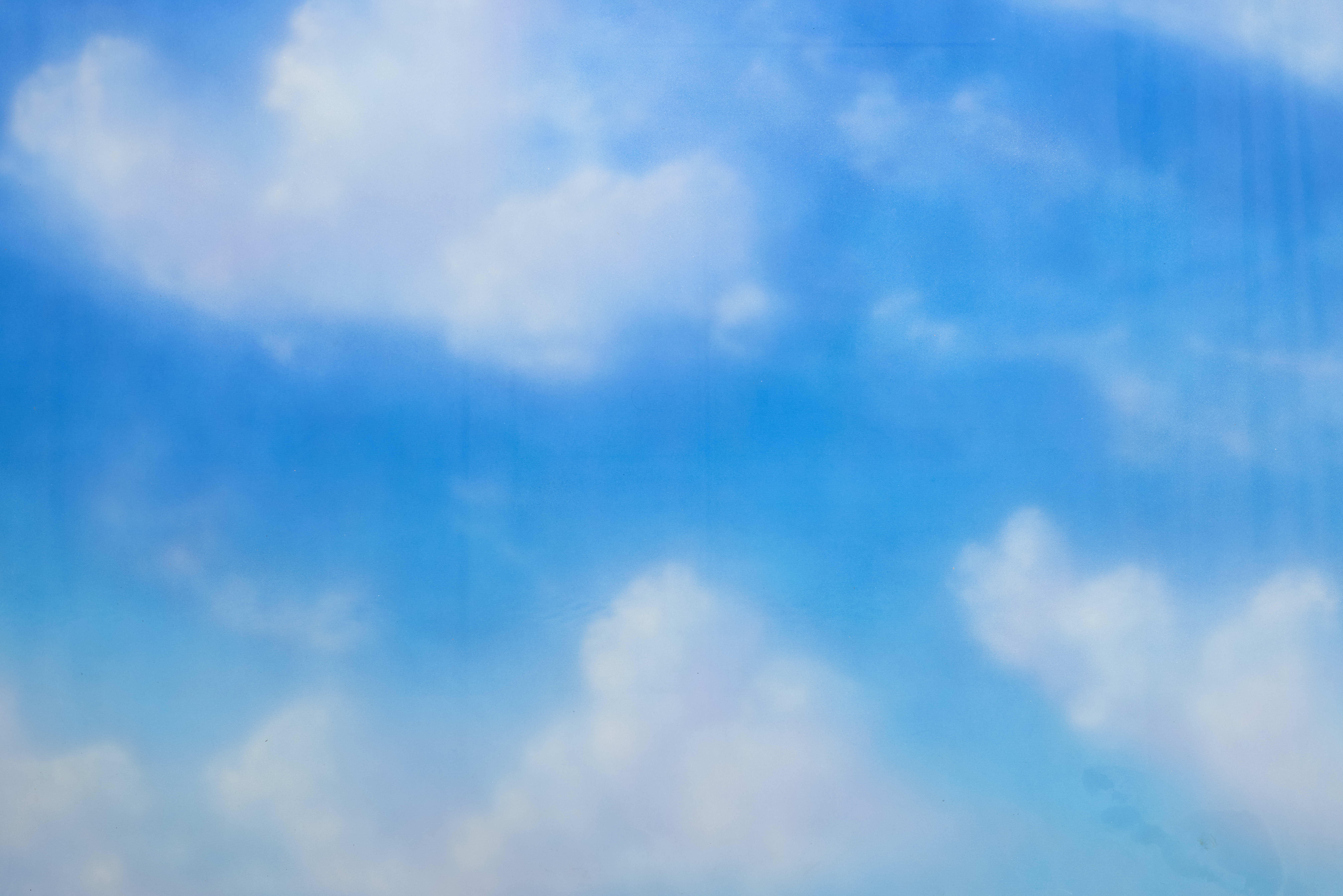 Backlight-able blue daytime sky with white clouds. This is painted on nylon fabric.