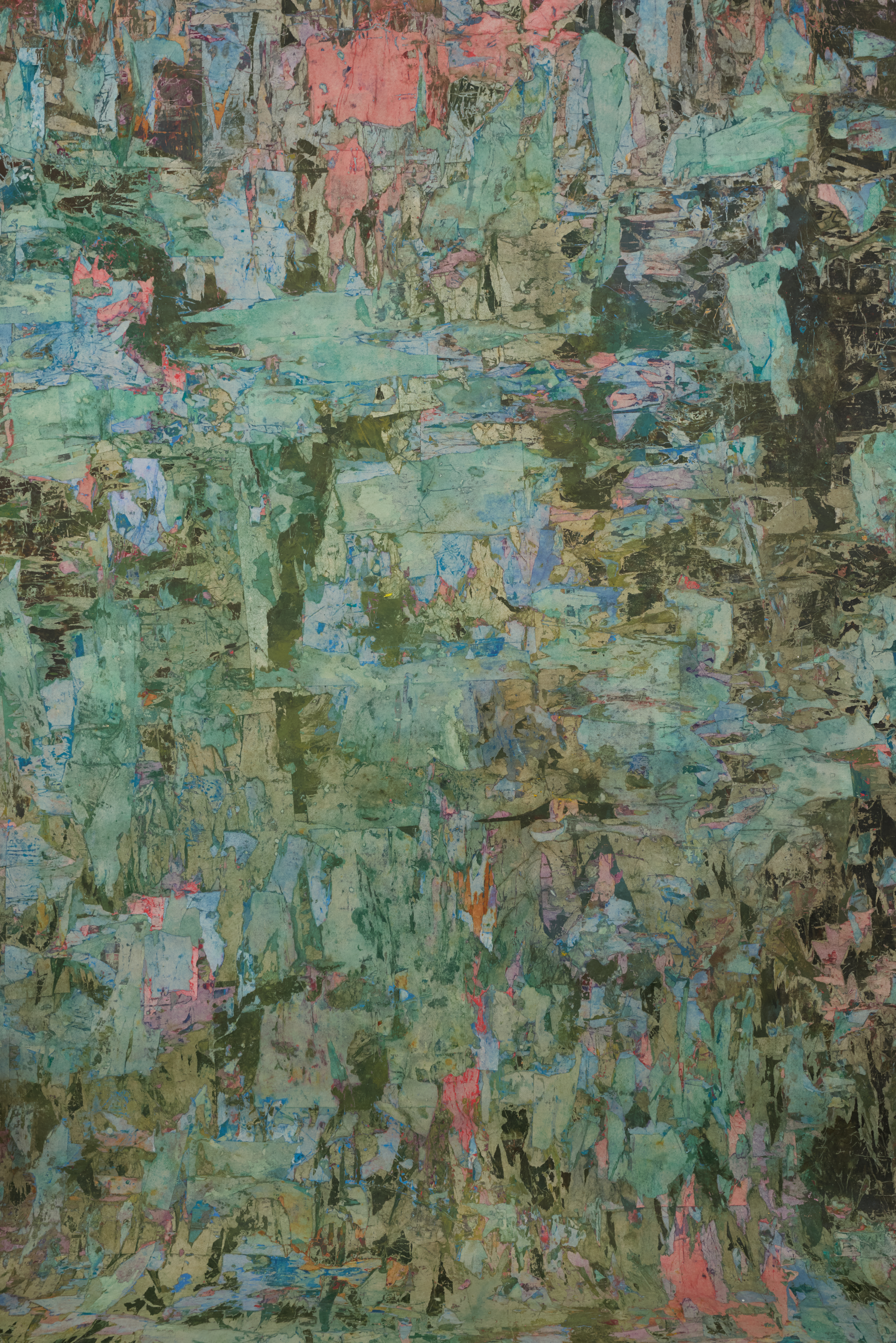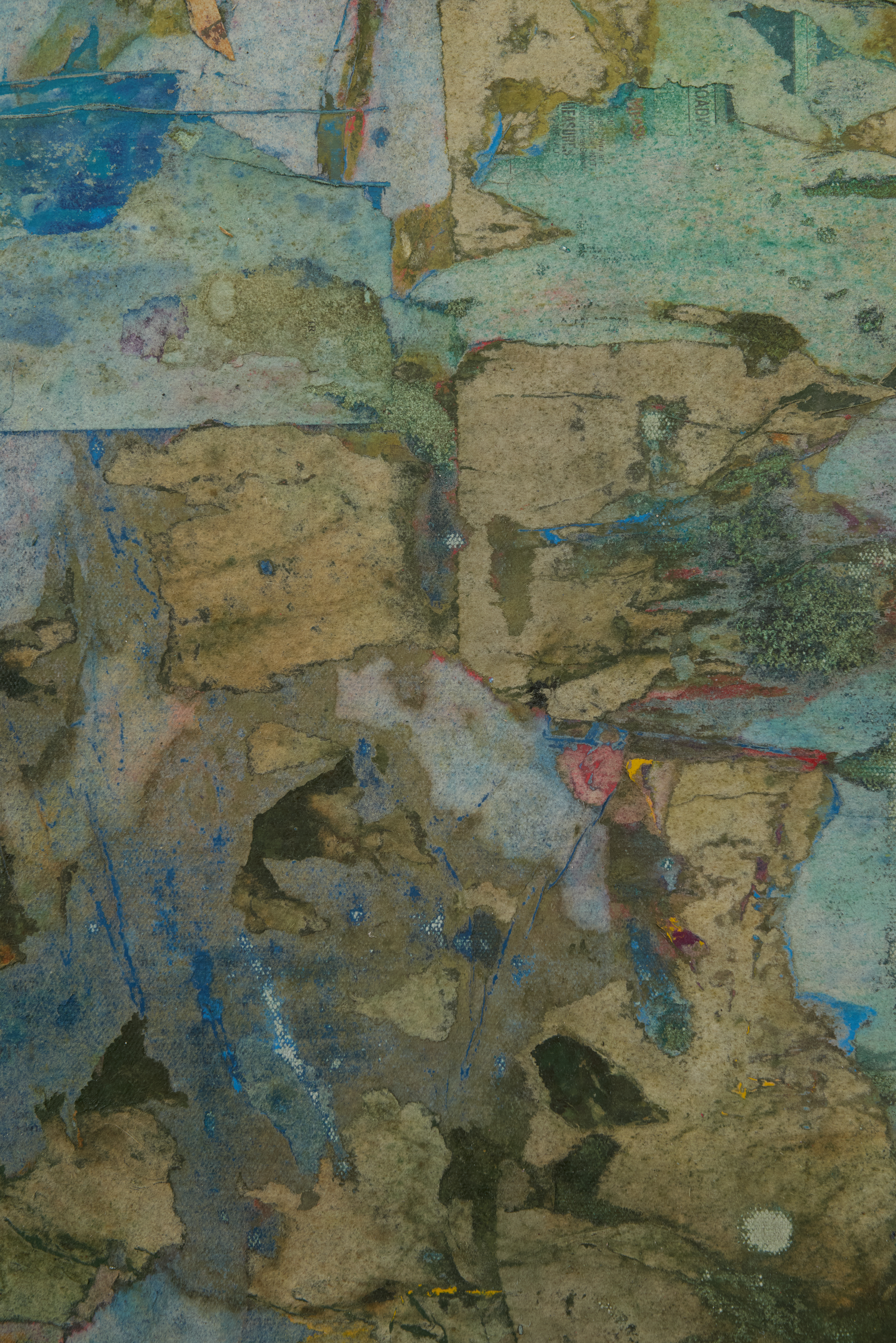 Newspaper collage effect in teal, green, and pink tones. Layered texture. Abstract texture.