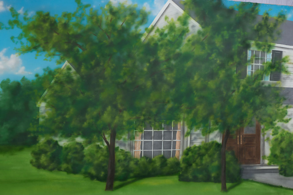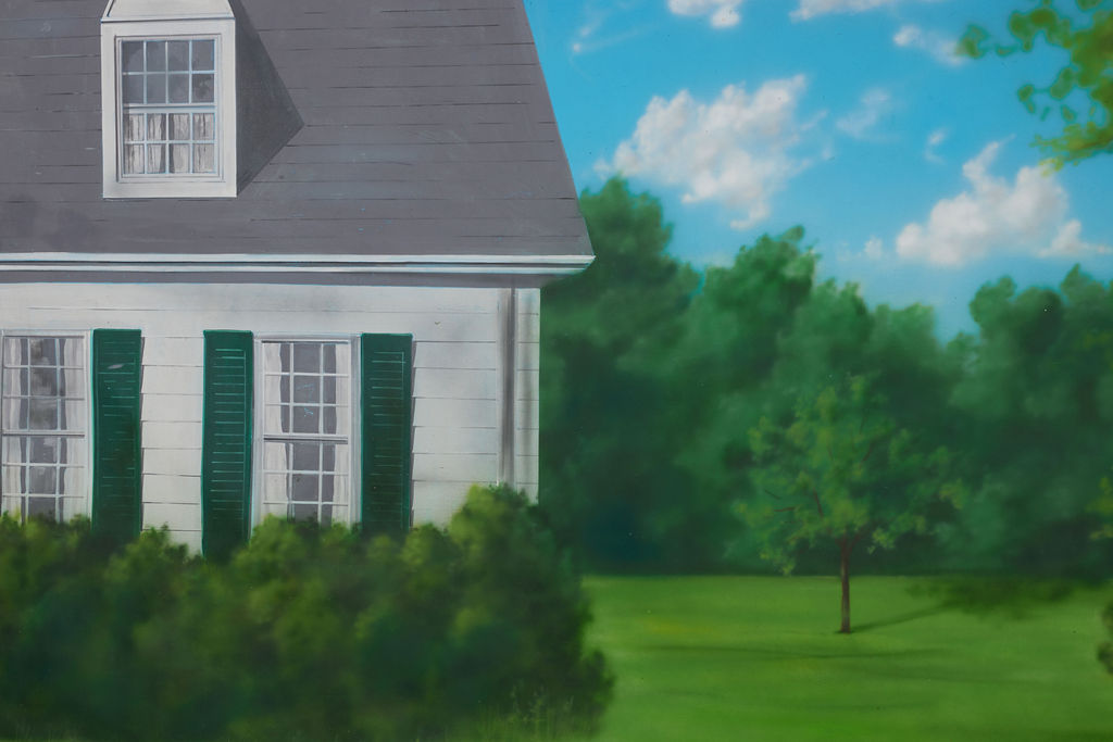 Suburban neighborhood. Lush summer greenery and white clapboard homes.