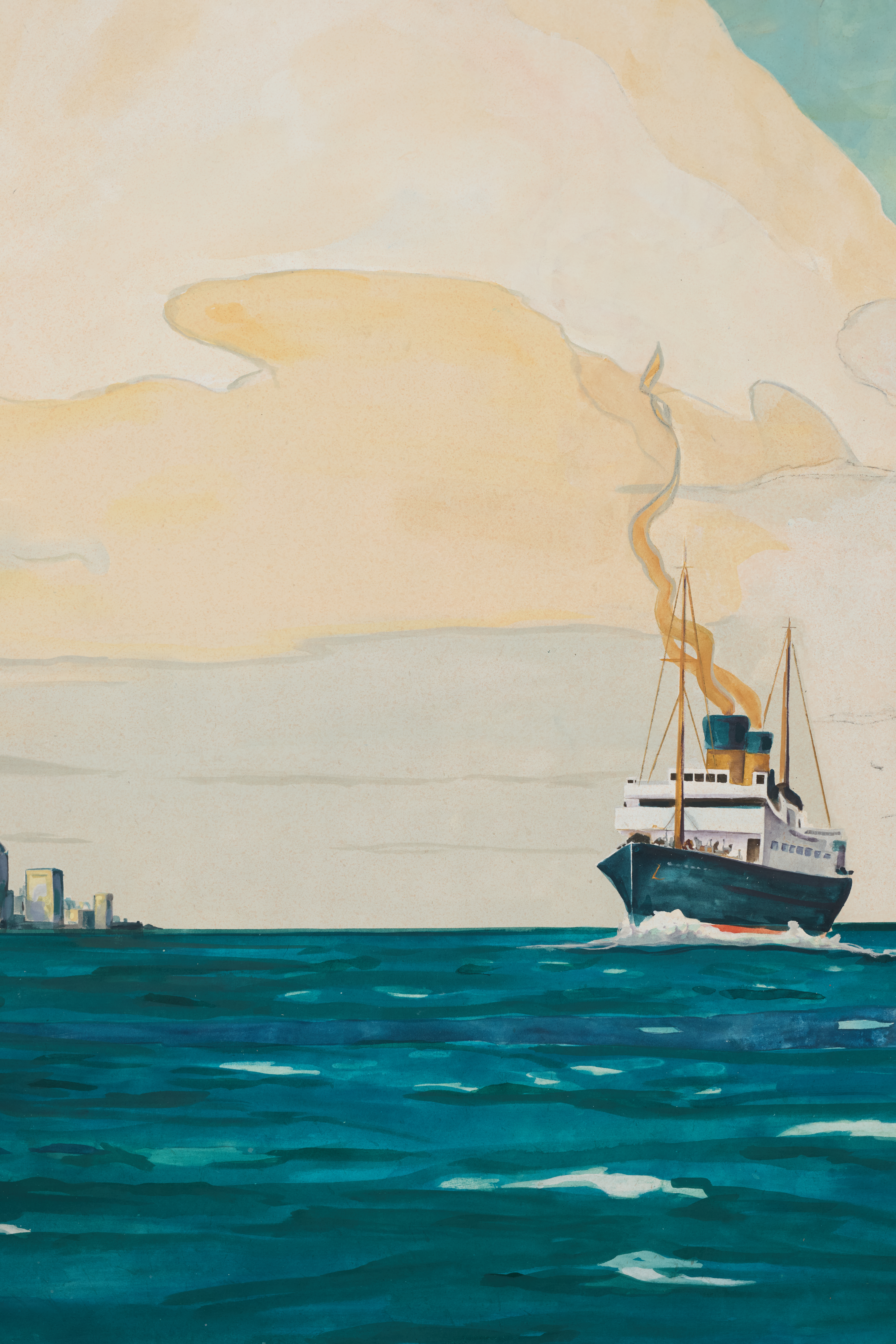 Ocean liner, blue sea, and skyline horizon. Postcard style. Sketch. NYC harbor.