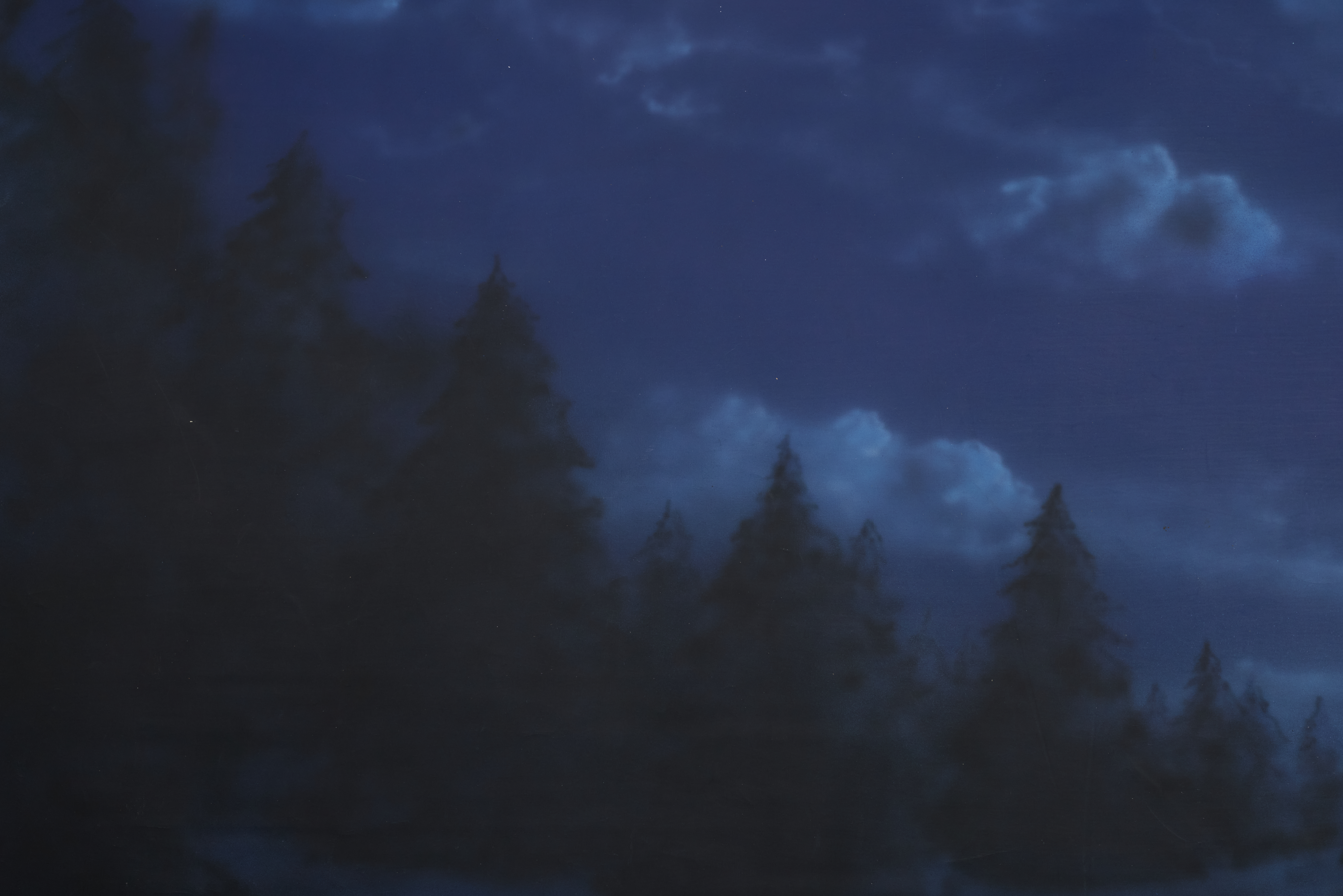Midnight forest, tree silhouettes, night sky.