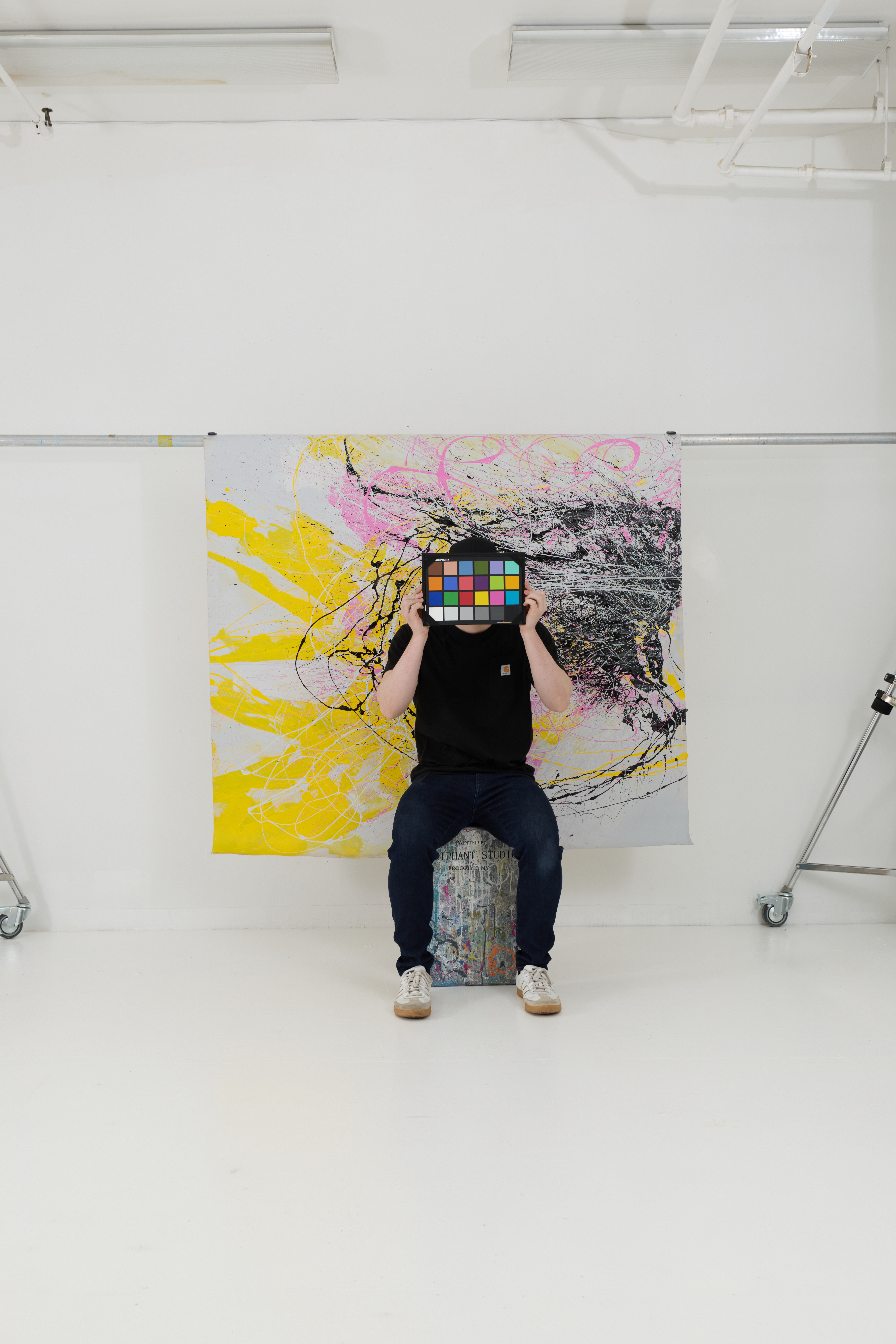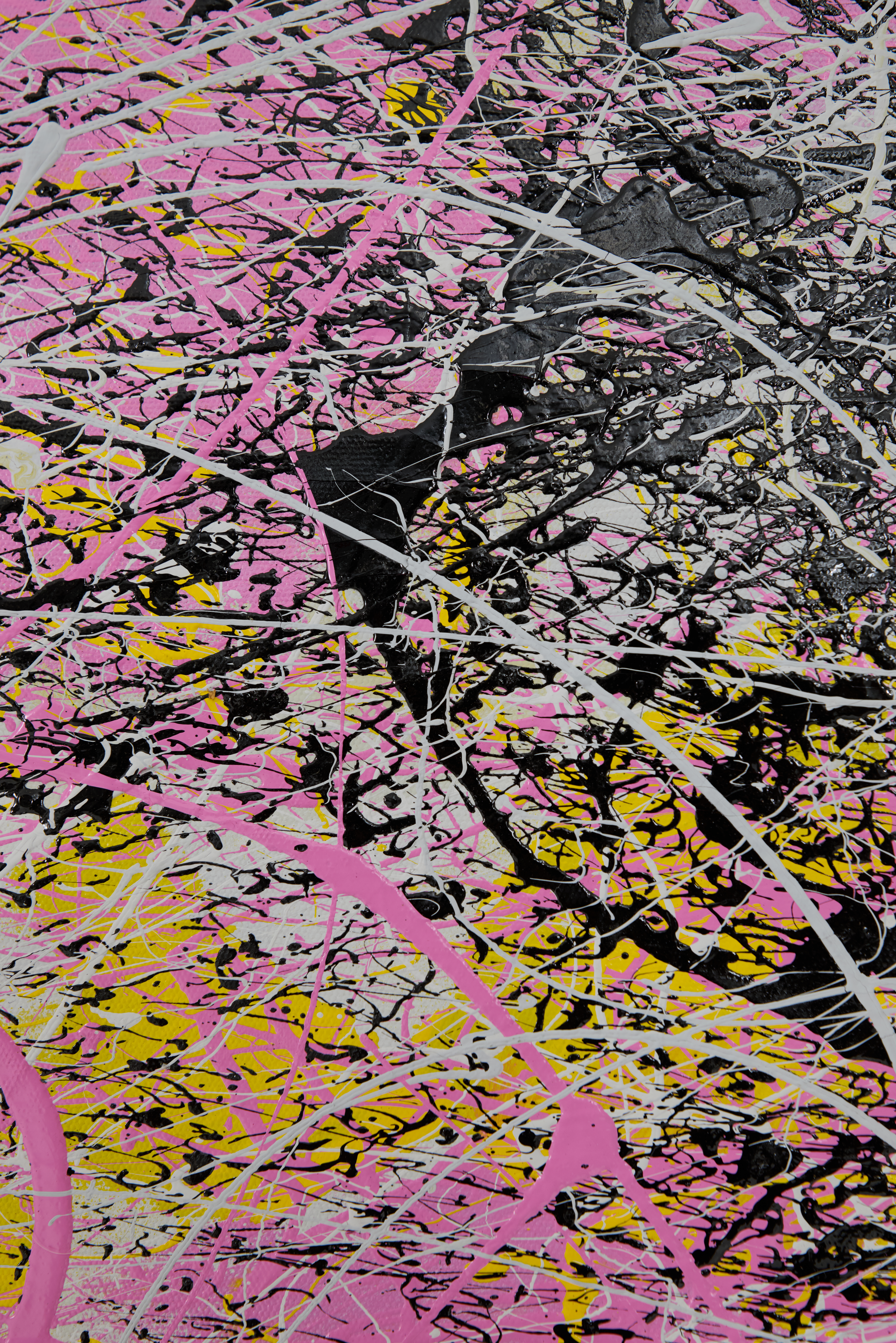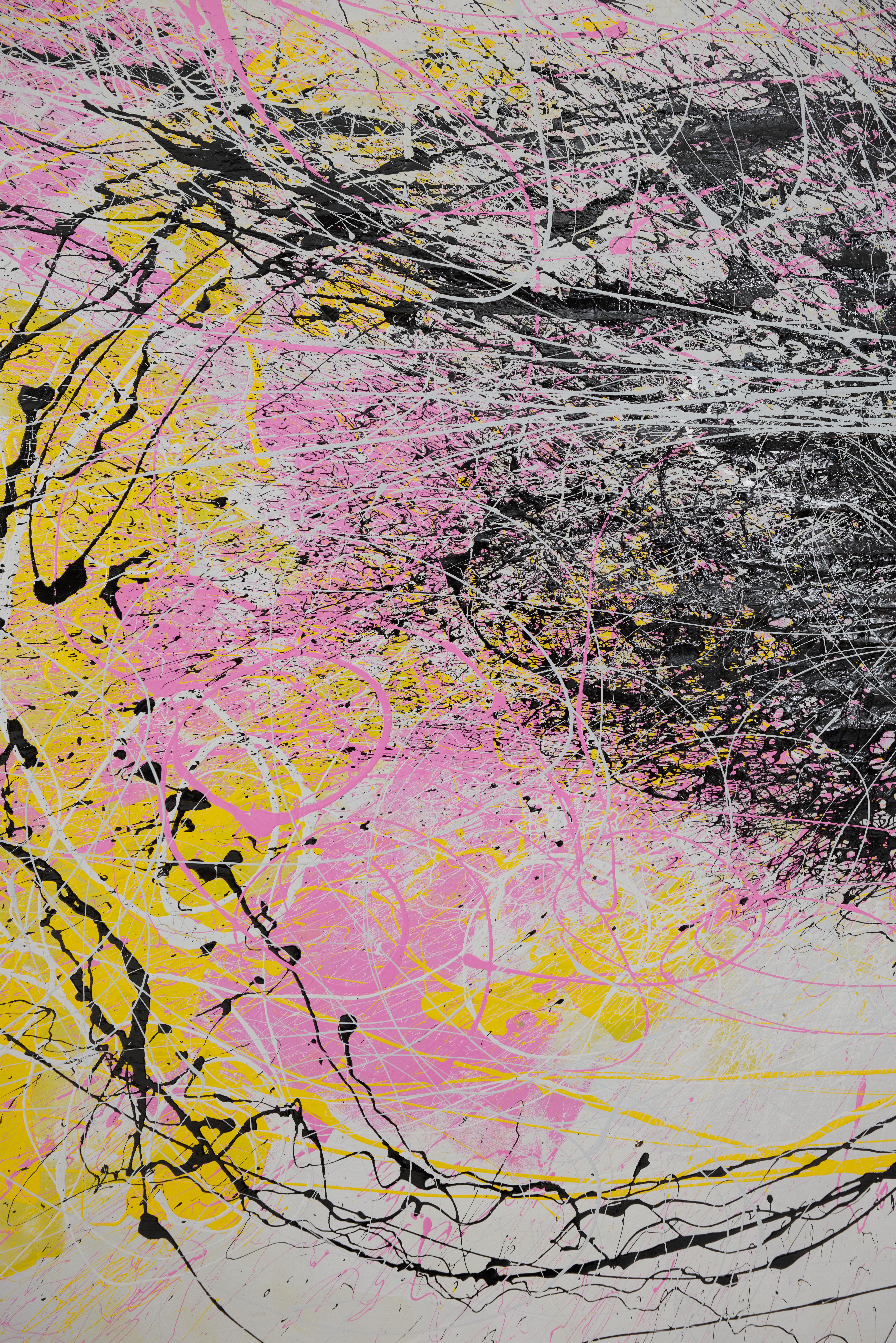 Yellow, pink, grey and black splatter. Abstract. Painterly