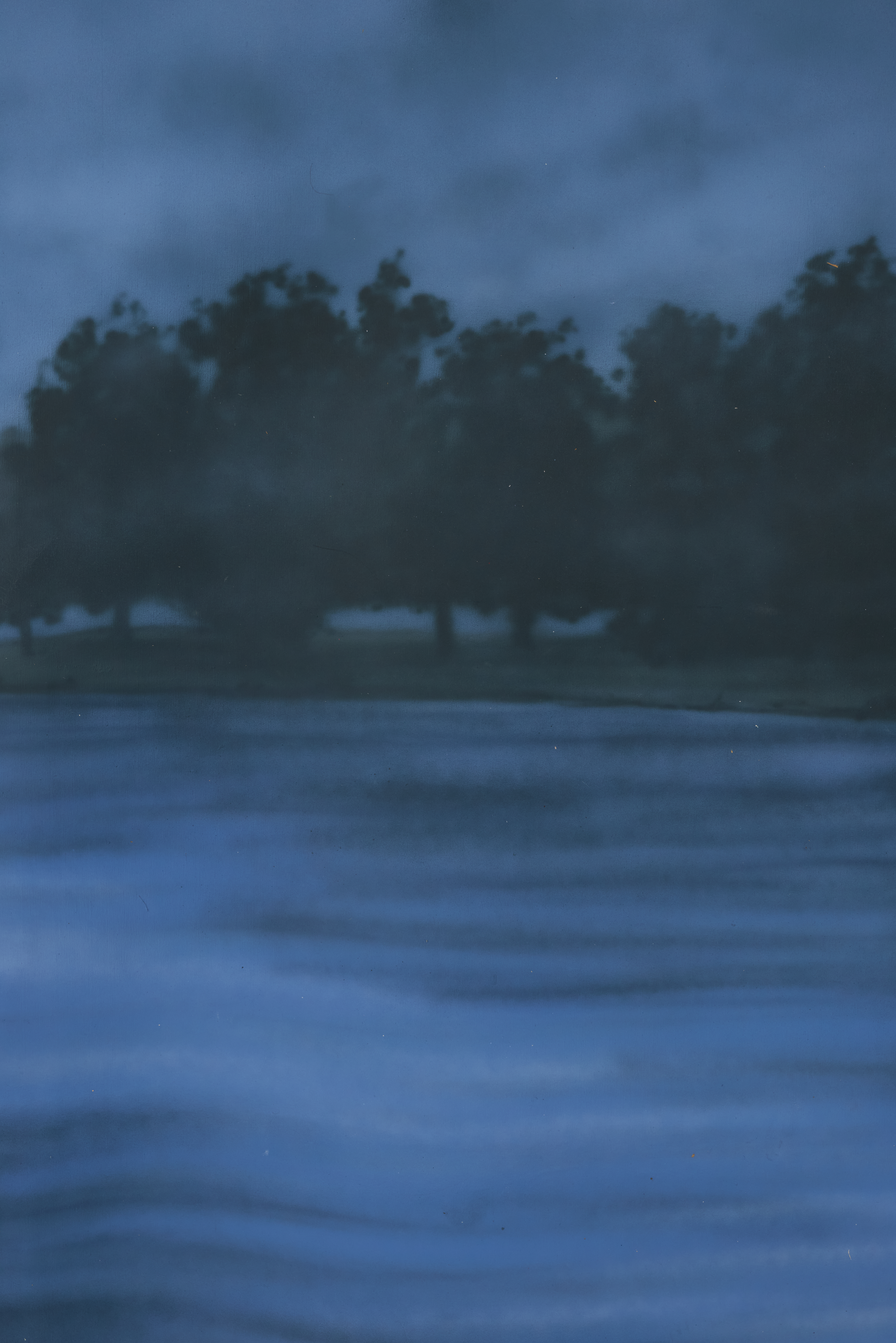 Lake landscape with misty water and soft tree silhouettes in blue and green tones