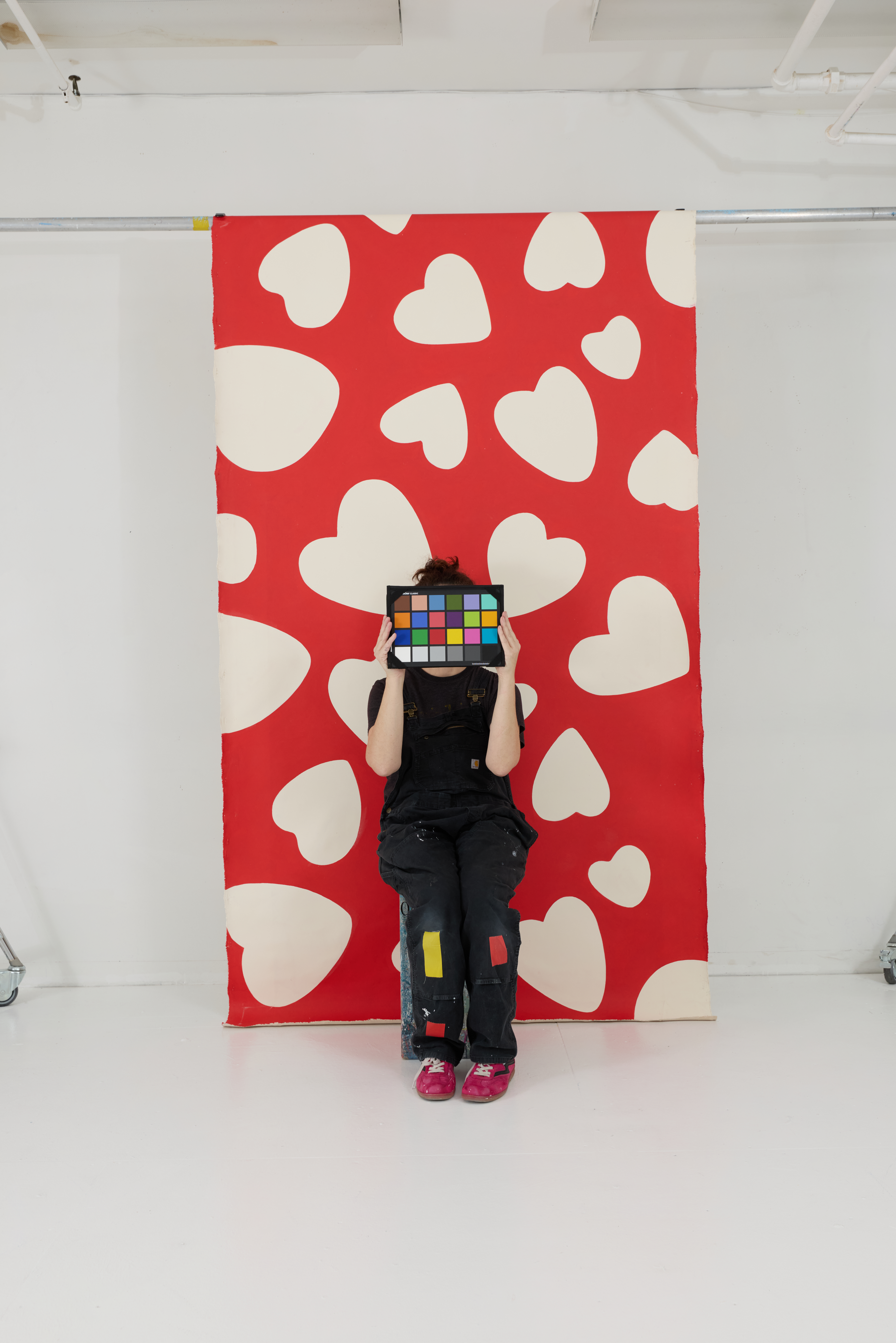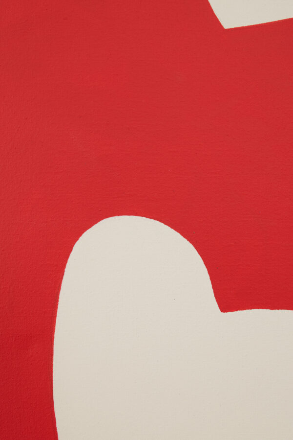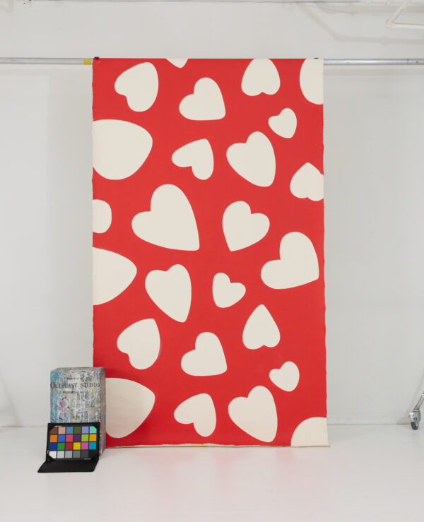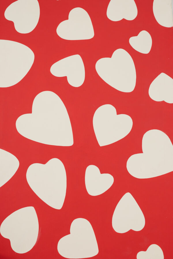 Ivory hearts against a red background. Pattern. Benjamin Moore Colors: Ivory Tusk 2153-70, Bull’s Eye Red 2002-20