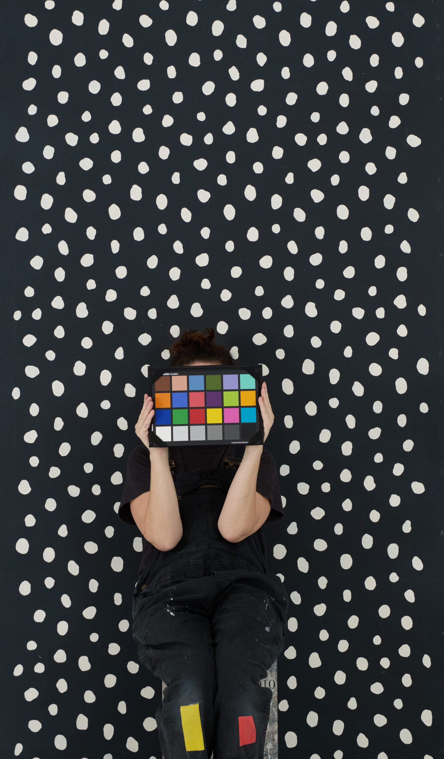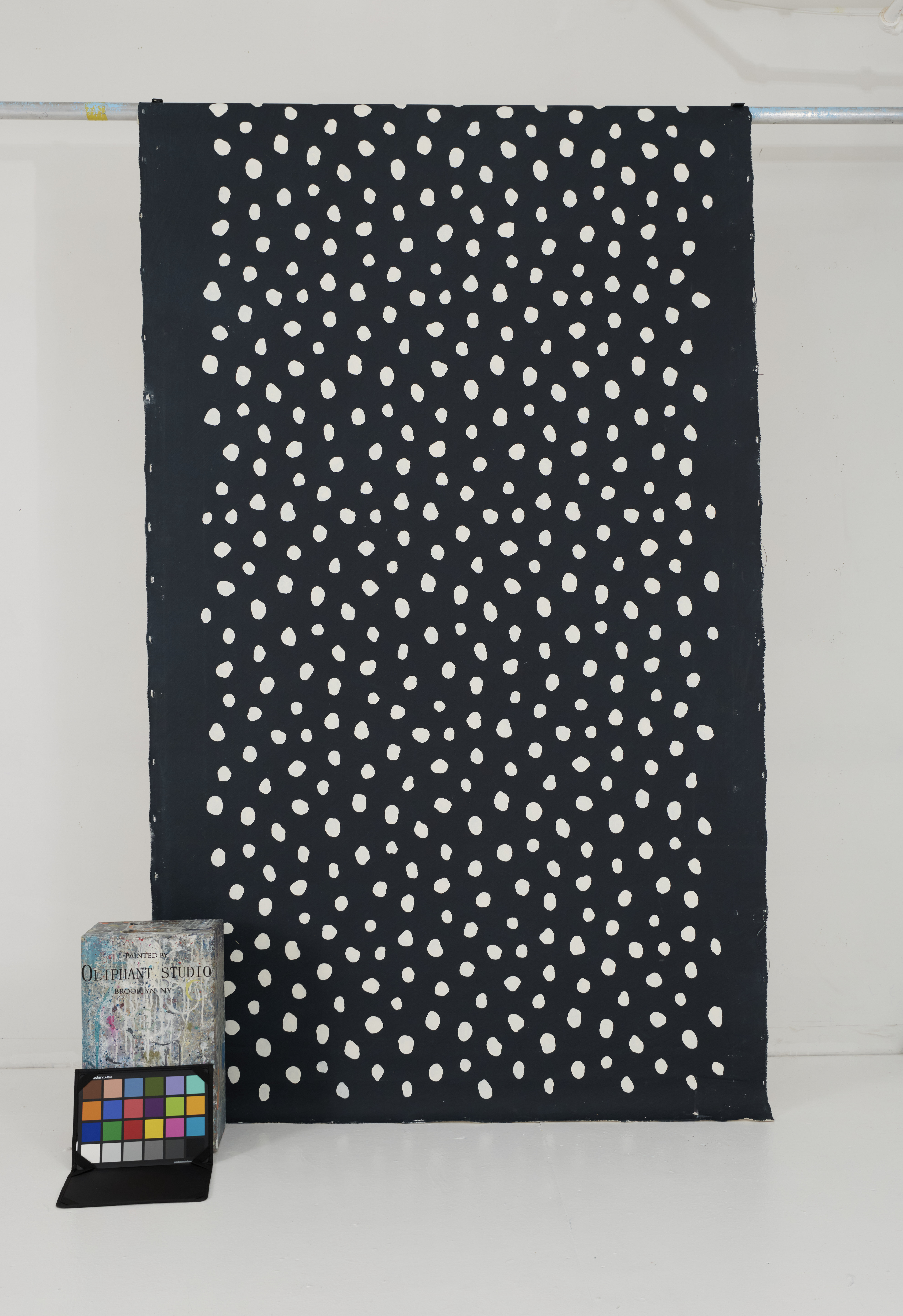 Painterly ivory polka dots against a black background. Benjamin Moore Colors: Ivory Tusk 2153-70, Black Ink 2127-20