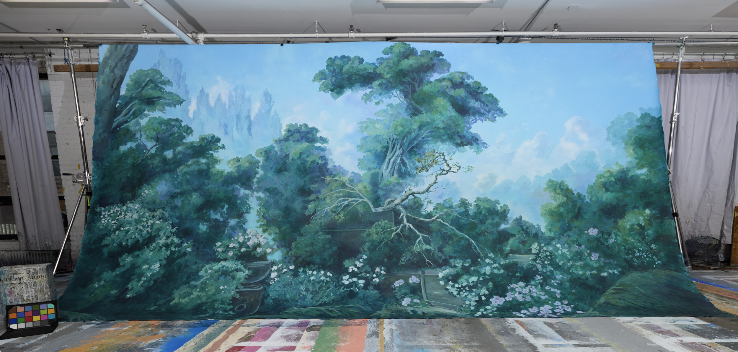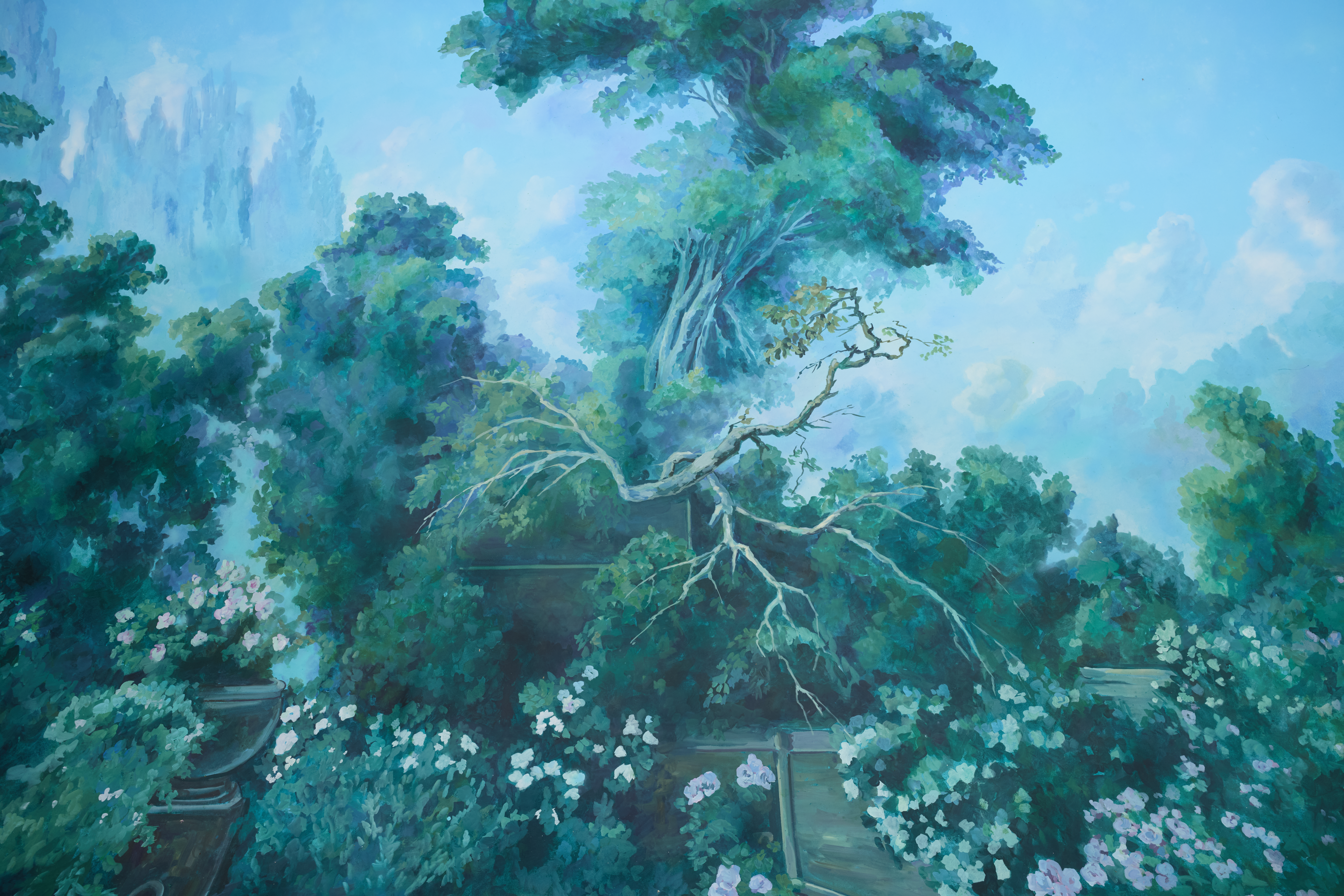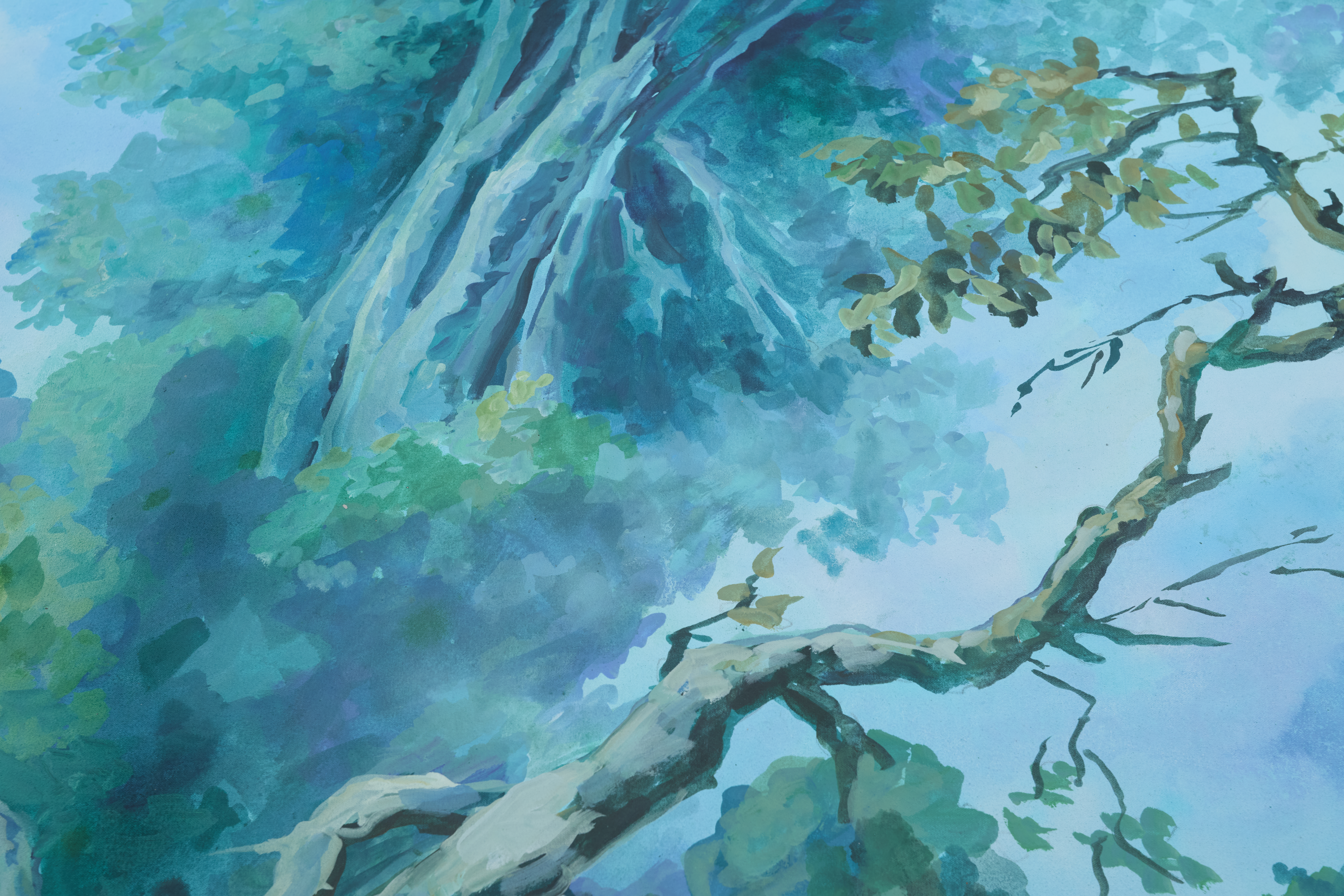 Pastoral, lush wooded garden with layered foliage and flowering details. Inspired by