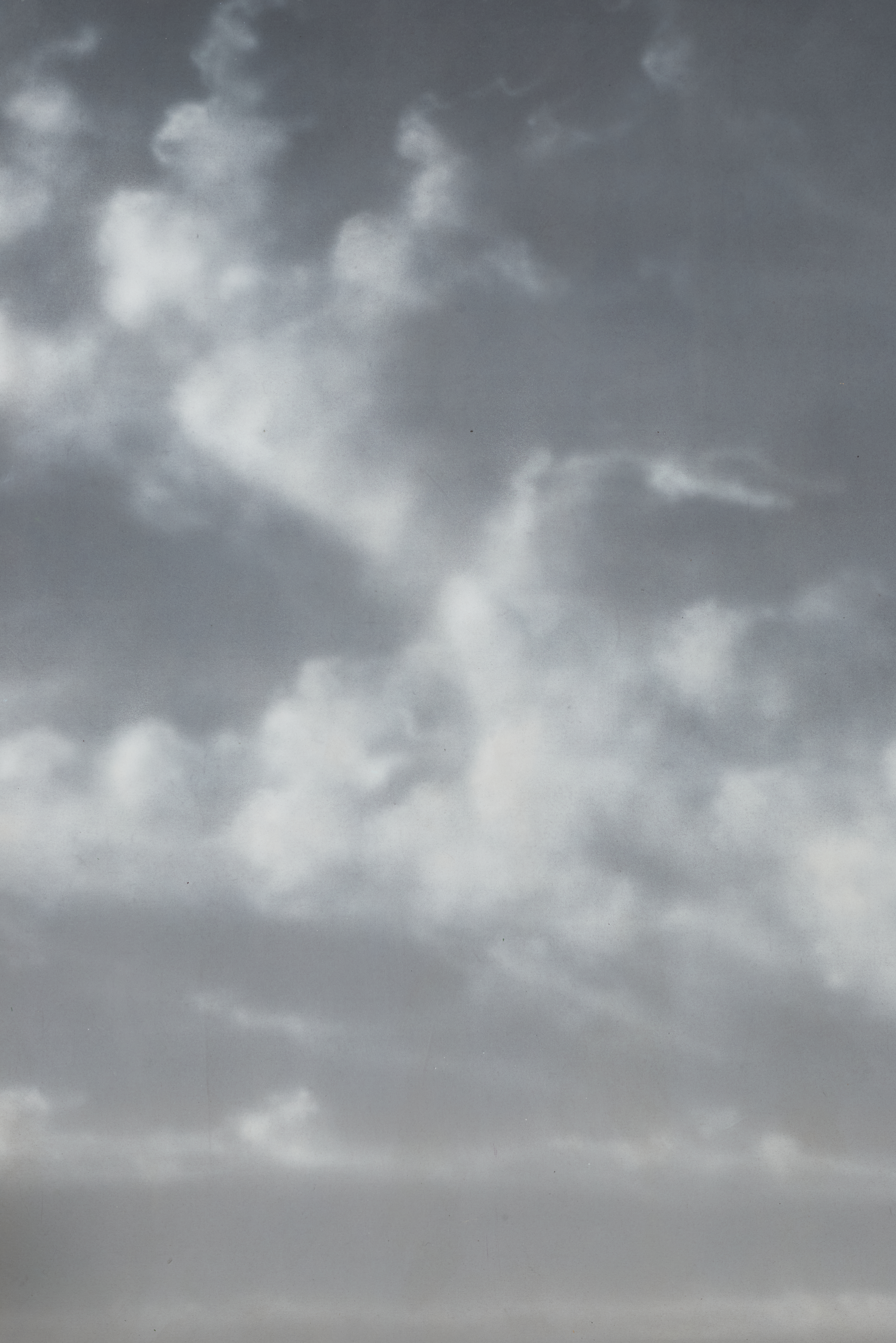 Monochromatic sky filled with scattered, billowing clouds against a gray background.