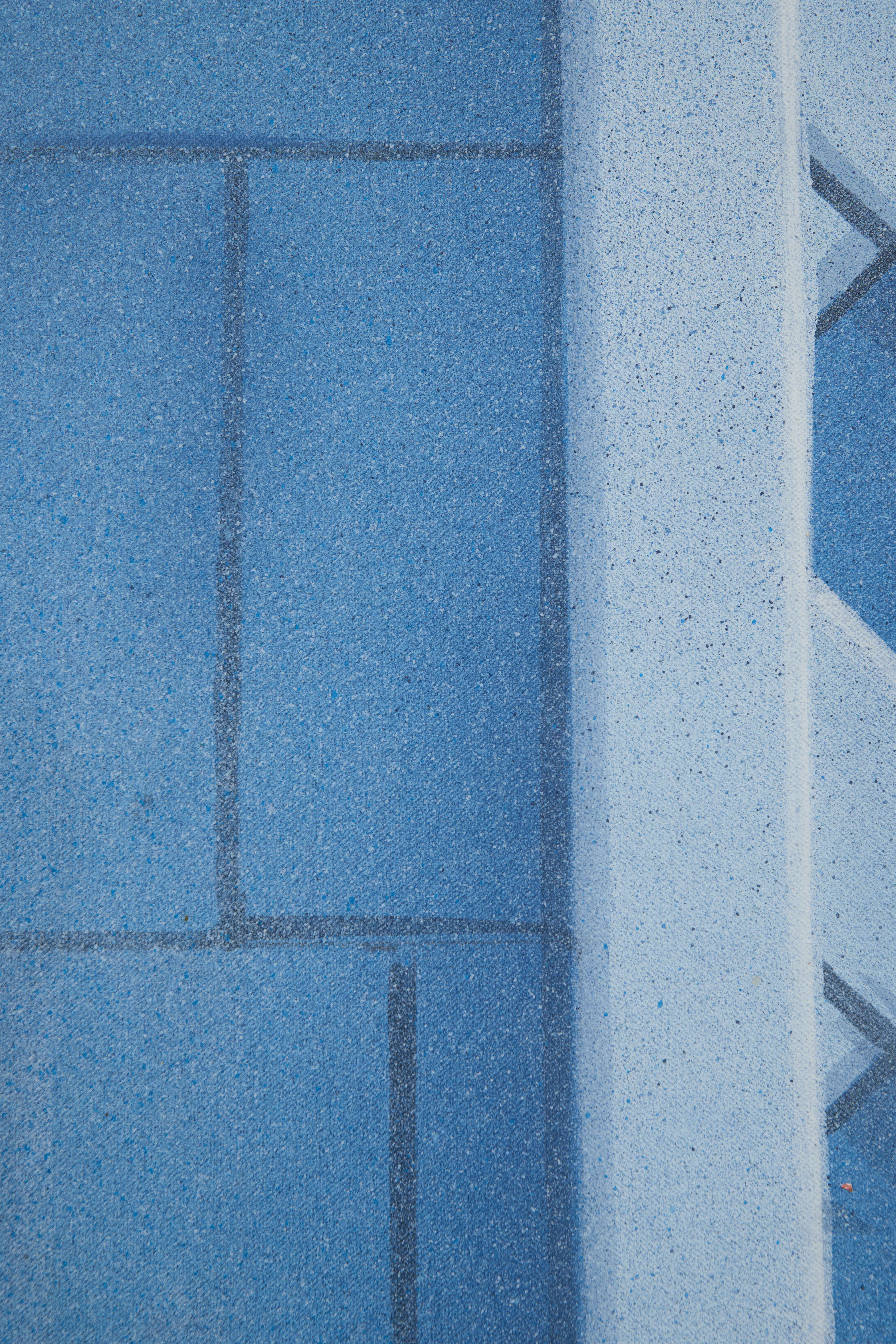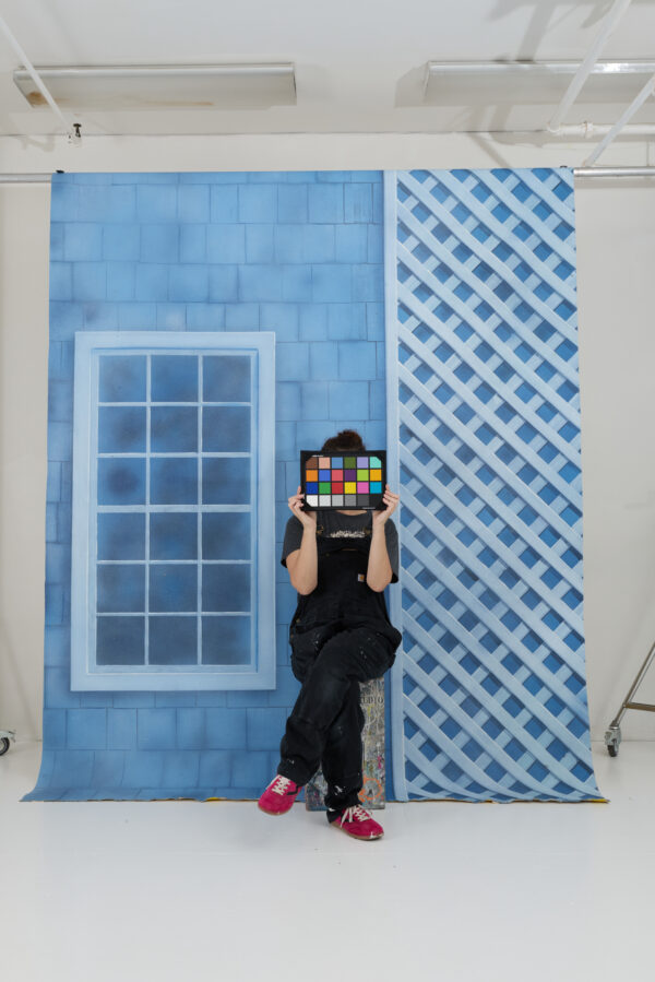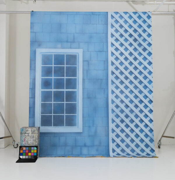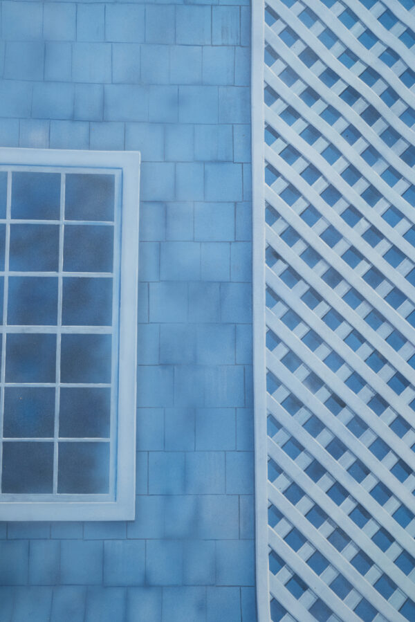 Cottage wall with blue shingles, a paned window, and white trellis.