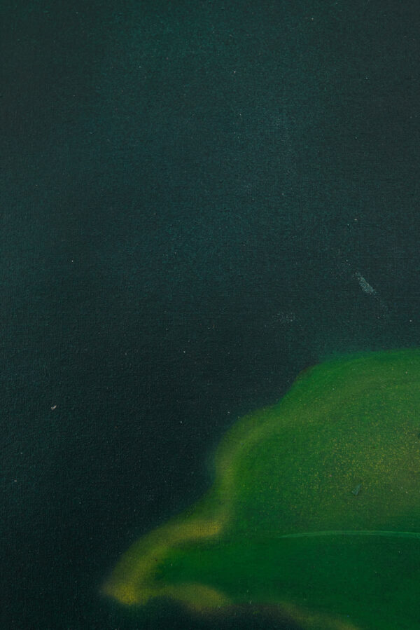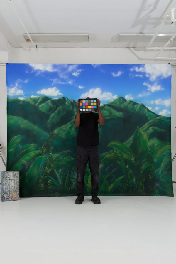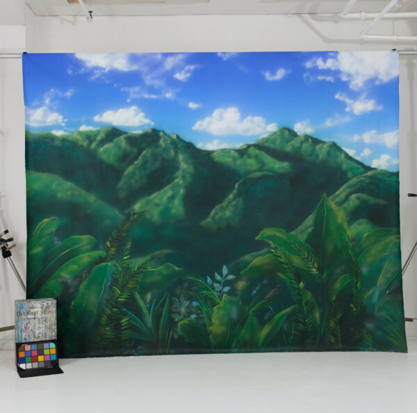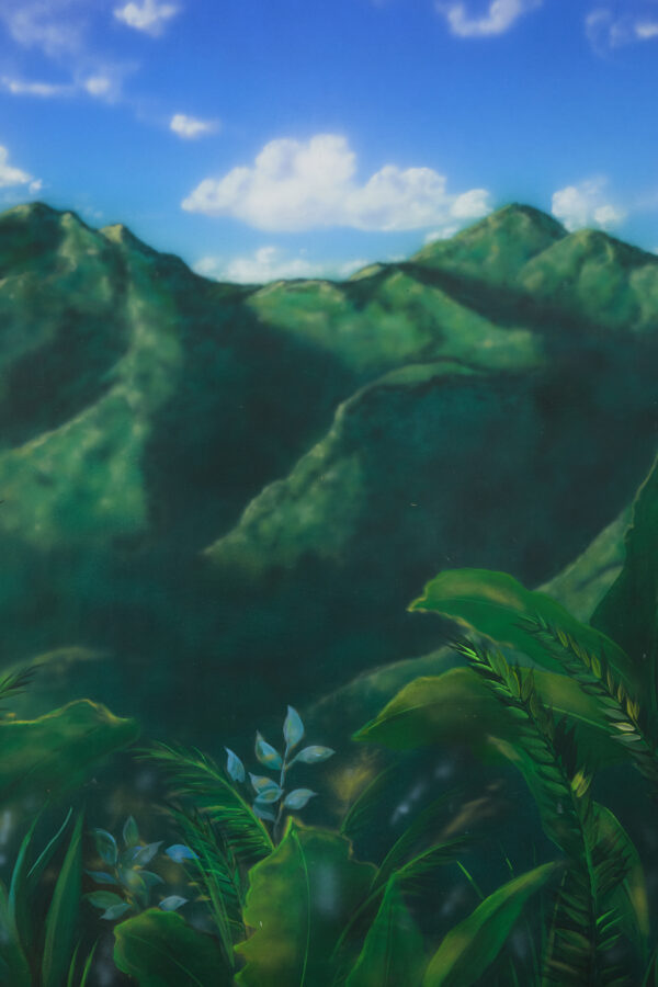 Tropical foliage, rolling green mountains, and a bright blue sky with clouds