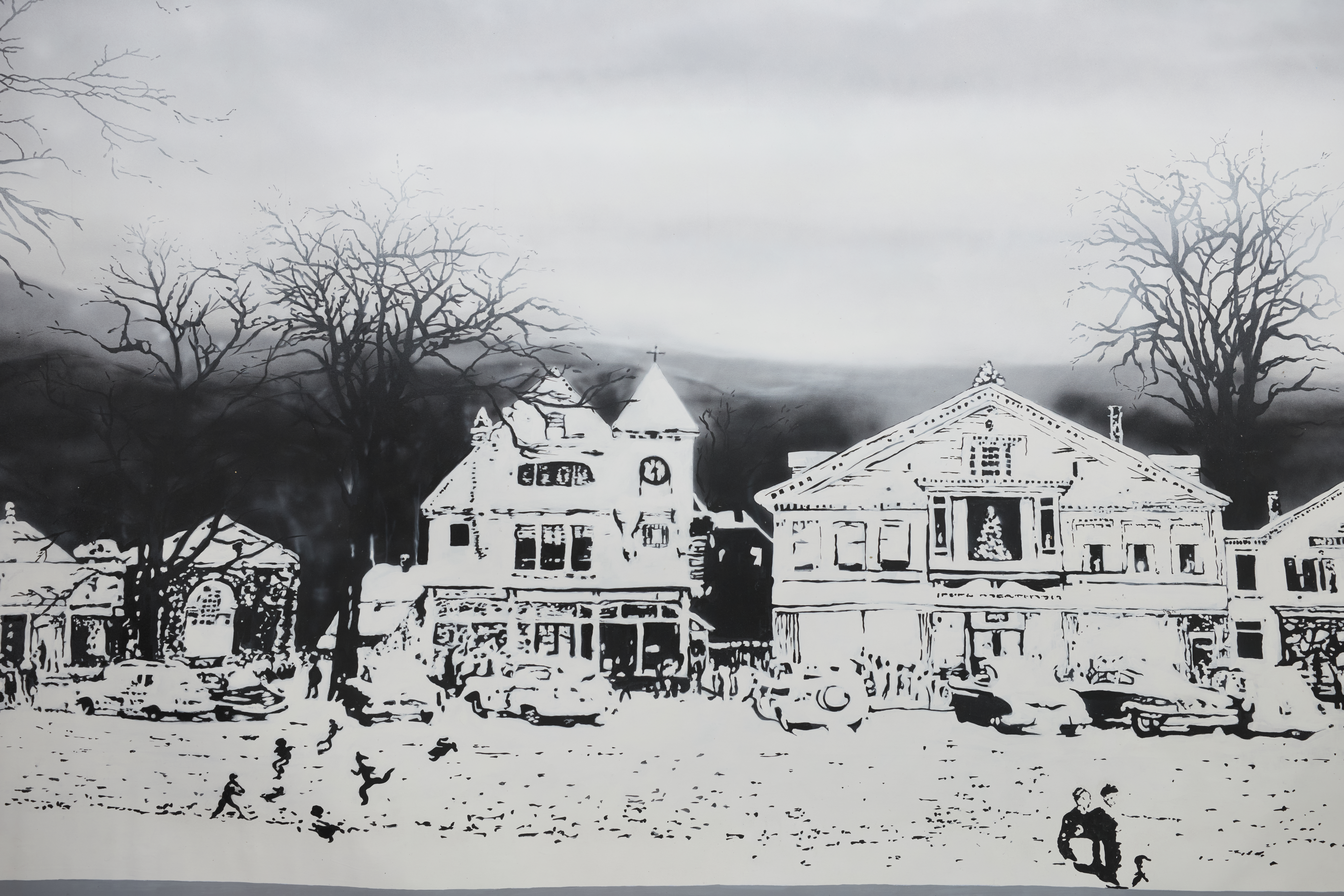 Black and white vintage winter village, snowy town scene. 6 inch grey border