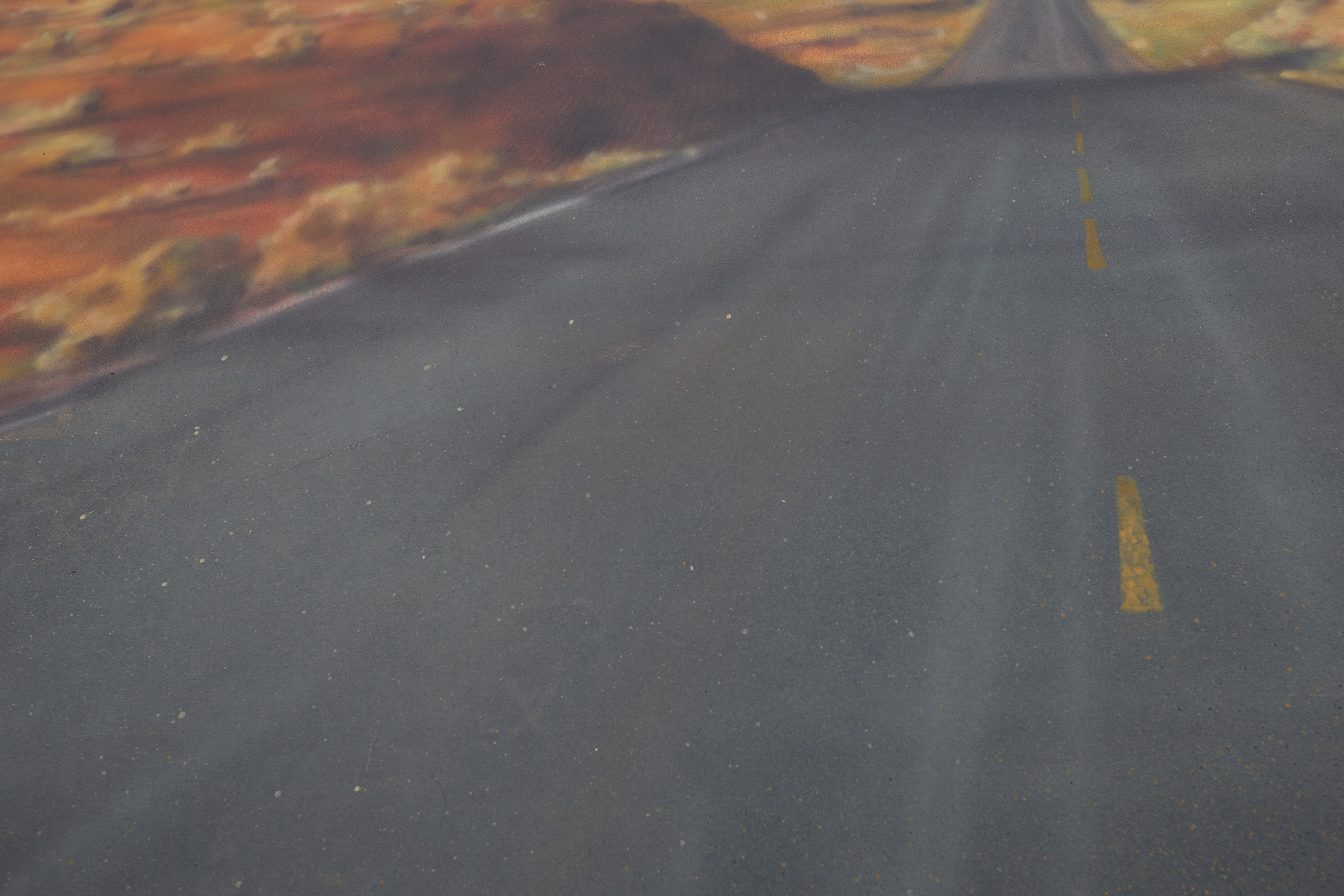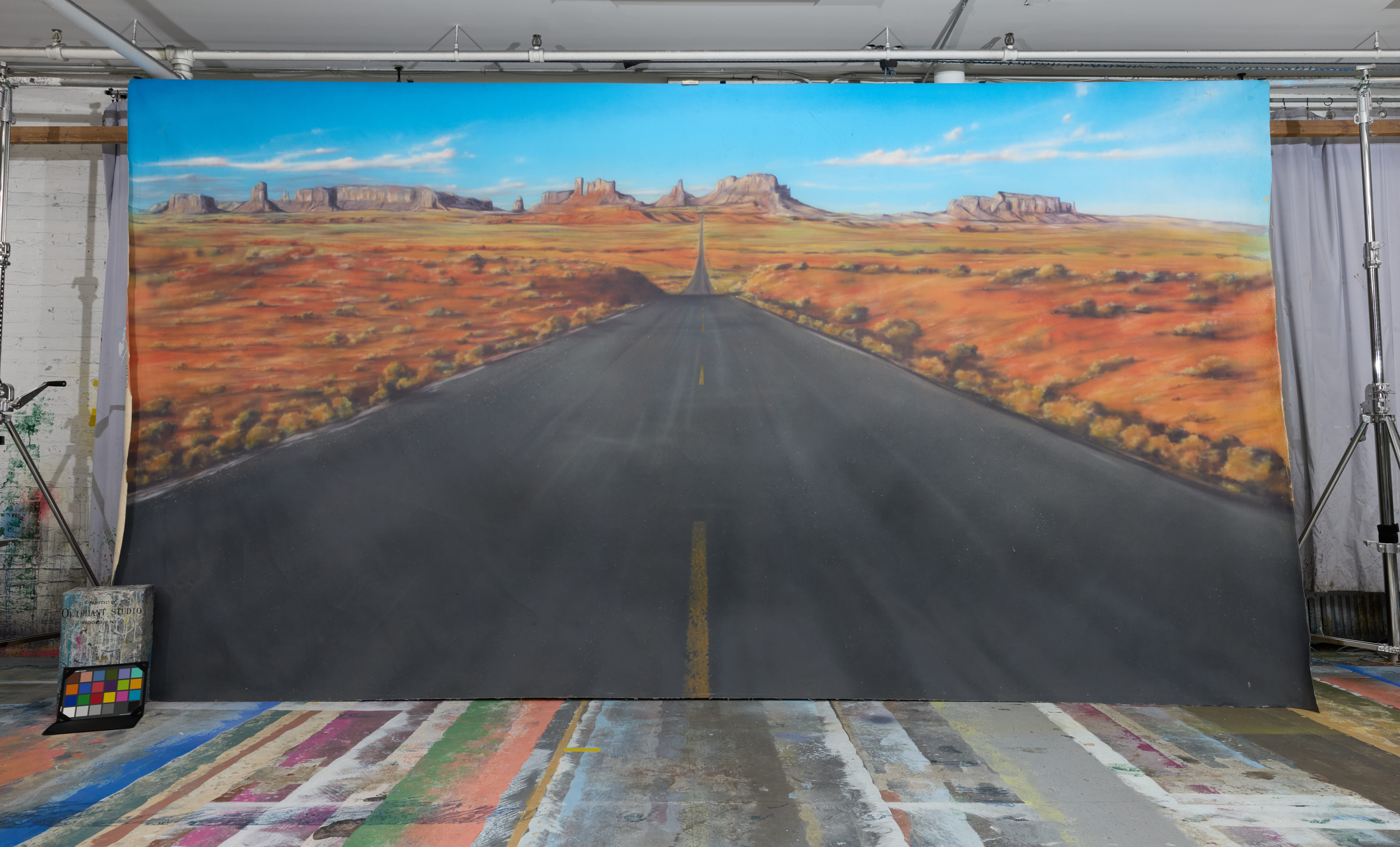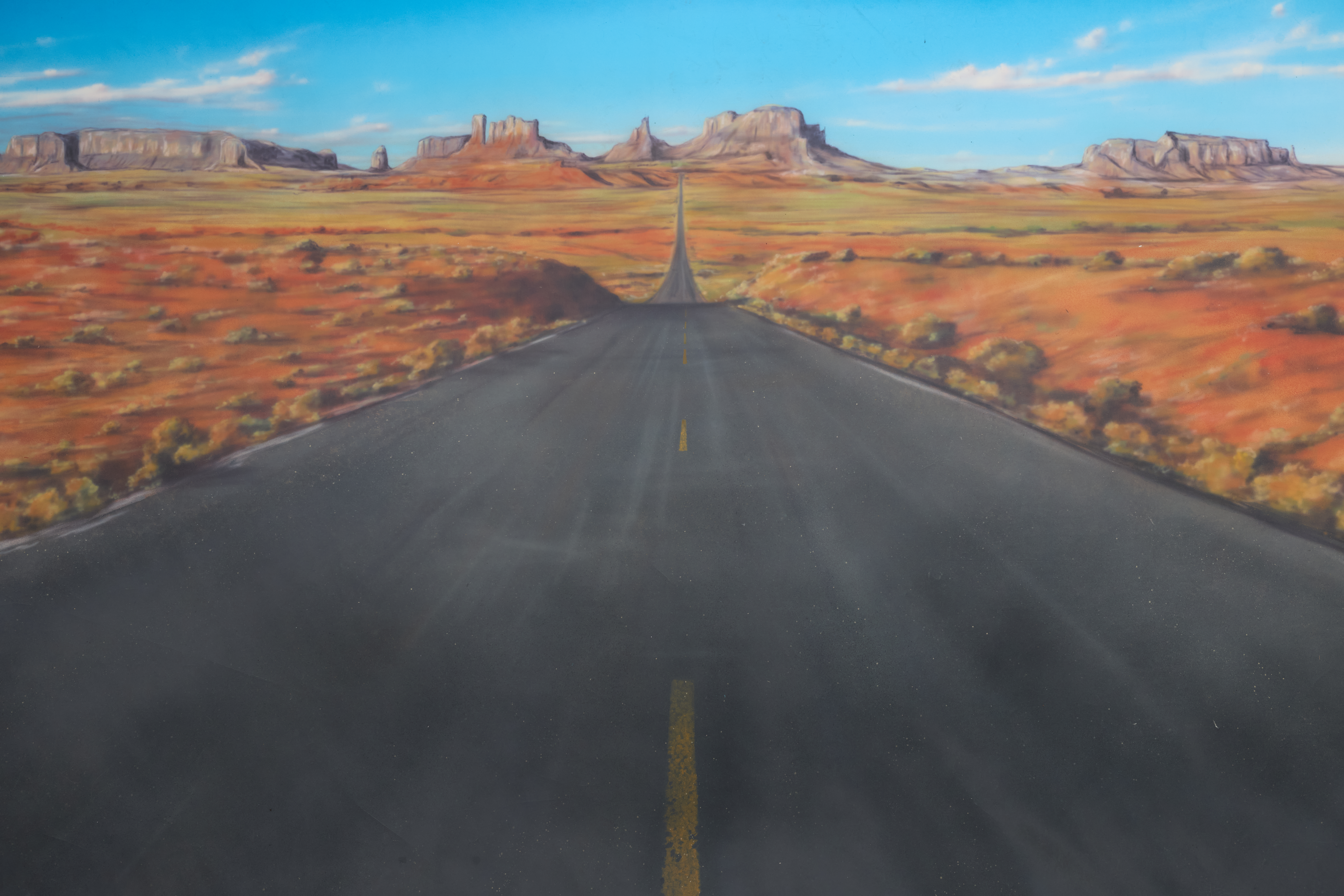 Southwest landscape, sandstone, desert rock formations, open grassland, and a long highway stretching toward plateaued horizons. This drop is VINTAGE.